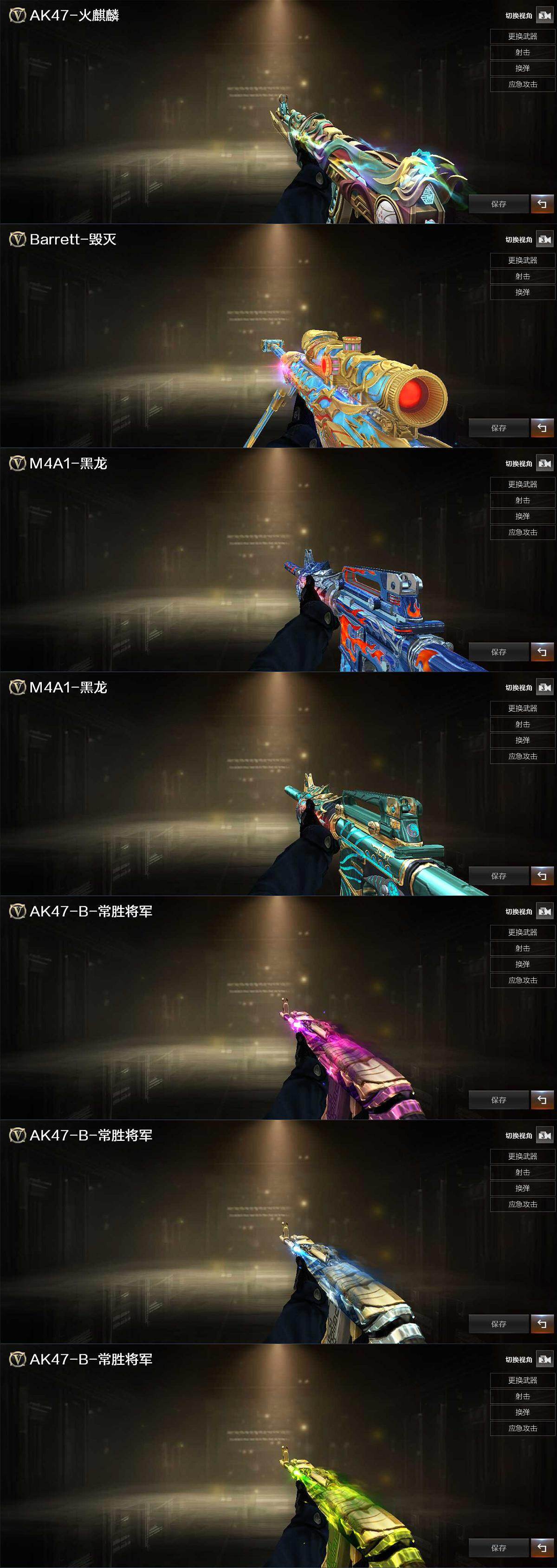 【英雄级武器】:AK47-火麒麟,M4A1-黑龙,M4A1-雷神*4,M4A1-黑骑士*4,Scar Light-白虎,AK47-B-常胜将军,Barrett-毁灭,炼狱-悦蓝-觉醒版,悦蓝-惊涛骇浪-觉醒版,沙鹰-修罗*5,COP 357-雷霆王者-觉醒版,COP 357-云龙,屠龙,幻灵之锋,王者之啸-觉醒版,王者之击-觉醒版,雷霆王者之锋-觉醒版,闪光弹-幻灵,闪光弹-雷霆王者-觉醒版*5,烟雾弹-云龙
