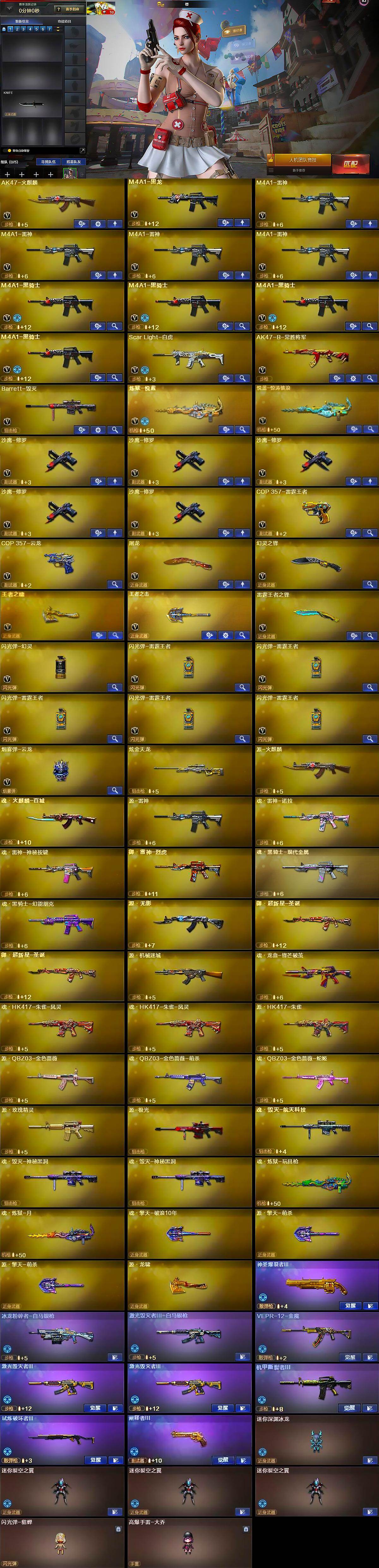 - [16880595]广西一区-57V-3王者-0炫金 【传说武器】:传说梦魇 【热门武器】:传说梦魇,Scar Light-白虎,M200-竞技荣光,M4A1-黑骑士,毁灭-孙三炮,USP-雷暴 【音效卡】:AK47-火麒麟音效卡,M4A1-黑龙音效卡,M4A1-黑骑士音效卡,Barrett-毁灭音效卡,Scar Light-白虎音效卡,Barrett-碧霄极光音效卡,炼狱-百战金芒-庆典舞曲音效卡 【皮肤】:Scar Light-白虎-暗星,雷神-宠儿-2019MVP,M4A1-再燃火线,AK47-火麒麟-传奇EVEN,毁灭-BEAN-2020MVP,毁灭-风暴,毁灭-英雄计划 皮肤,黑龙-墨子皮肤,黑骑士-伏羲,战神-粉色甜心皮肤,战神-紫绶金章皮肤,轻型军用手斧-再燃火线 【角色】:电竞教官-云悠悠,初恋灵狐,葵-赛博朋克,铁骑荣耀,兔囡囡 【人偶武器】:毁灭-孙三炮,AWM-灵狐-15周年嘉年华,迷你裂空之翼*2,夺魂,生化手雷-机甲核心 【暴走生化】:超级对讲机 【挑战大师】:神圣爆裂者III,激光毁灭者III-白马银枪,VEPR-12-金魔,激光毁灭者III 【英雄级武器】:AK47-火麒麟,M4A1-黑龙,M4A1-雷神,M4A1-黑骑士,AK47-无影,Scar Light-白虎,FAMAS G2-天戎,AK-47-猩红传说,王者冰魄-觉醒版,王者风势-觉醒版*2,Barrett-毁灭*2,AWM-裁决,M200-竞技荣光,炼狱-百战金芒,USP-雷暴,柯尔特-竞技荣光*6,擎天-竞技荣光*4,麒麟刺-百战金芒,高爆手雷-竞技荣光*7,闪光弹-竞技荣光*8,烟雾弹-竞技荣光*7,Barrett-碧霄极光 【道具】:BS战队炫彩背包,R.LGD炫彩背包,百战金芒炫彩背包,女皇终结者-魔龙之吻,绿色巨人,灵魂忍者,变异宝贝,妖姬,迷雾幽灵*2,夺命之镰,防化服*3,语音特效-盛典烟火,萌萌小葵表情,防弹头盔*5,防弹衣*5,C4工具钳*4,手雷包*5 【特殊枪械】:1白虎,1黑骑士