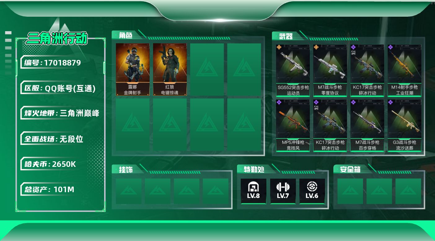 [17018879]【特价出售/店主推荐】101m总资产-2650k哈伏币-60烽火等级-三角洲巅峰-1战场等级-无军衔 【干员外观】:红狼-电锯惊魂,露娜-金牌射手 【近战皮肤】:近战-黑鹰 【传说外观】:M7战斗步枪-零度协议,SG552突击步枪-运动员 【史诗外观】:KC17突击步枪-碎冰行动,M7战斗步枪-百步穿杨,G3战斗步枪-流沙送葬,AS Val突击步枪-百步穿杨,MP5冲锋枪-深海恐惧,MP5冲锋枪-竞技风,Vector冲锋枪-百步穿杨,M14射手步枪-工业狂潮,SV-98狙击步枪-猎鳄行动,M700狙击步枪-百步穿杨,AWM狙击步枪-流沙送葬,沙漠之鹰-曙光 【稀有外观】:M4A1突击步枪-繁盛,AKM突击步枪-肃杀,ASh-12战斗步枪-繁盛,AUG突击步枪-指挥官,M7战斗步枪-前沿科技,SCAR-H战斗步枪-荣耀列队,AS Val突击步枪-前沿科技,腾龙突击步枪-冰天雪地,MP5冲锋枪-弄臣,MP5冲锋枪-哈夫克卫队,UZI冲锋枪-亚特兰蒂斯,SMG-45-行动开启,勇士冲锋枪-主宰,勇士冲锋枪-冰天雪地,Mini-14射手步枪-荣耀列队,SKS射手步枪-弄臣,SR-25射手步枪-开拓,SR-25-行动开启,PSG-1射手步枪-主宰,SV-98狙击步枪-星链科技,SV-98狙击步枪-哈夫克航天,SV-98狙击步枪-精英联盟 【普通外观】:AKM突击步枪-噬菌体,M7战斗步枪-噬菌体,PTR-32突击步枪-噬菌体,勇士冲锋枪-噬菌体,M4A1突击步枪-粉色涂装,M4A1突击步枪-高雅黑,M4A1突击步枪-海色,QBZ95-1突击步枪-高雅黑,QBZ95-1突击步枪-海浪,QBZ95-1突击步枪-海色,QBZ191突击步枪-三角洲力量,K416突击步枪-几何迷彩,K416突击步枪-高雅黑,M16A4突击步枪-高雅黑,AUG突击步枪-浅蓝涂装,M7战斗步枪-红色涂装,SG552突击步枪-海浪,AK-12突击步枪-变色龙,SCAR-H战斗步枪-红色涂装,SCAR-H战斗步枪-数码迷彩,G3战斗步枪-高雅黑,PTR-32突击步枪-黄蜂,CAR-15突击步枪-变色龙,K437突击步枪-磐石,MP5冲锋枪-海色,MP5冲锋枪-黄蜂,Vector冲锋枪-几何迷彩,UZI冲锋枪-海色,野牛冲锋枪-高雅黑,SR-3M紧凑突击步枪-变色龙,QCQ171冲锋枪-三角洲力量,M1014