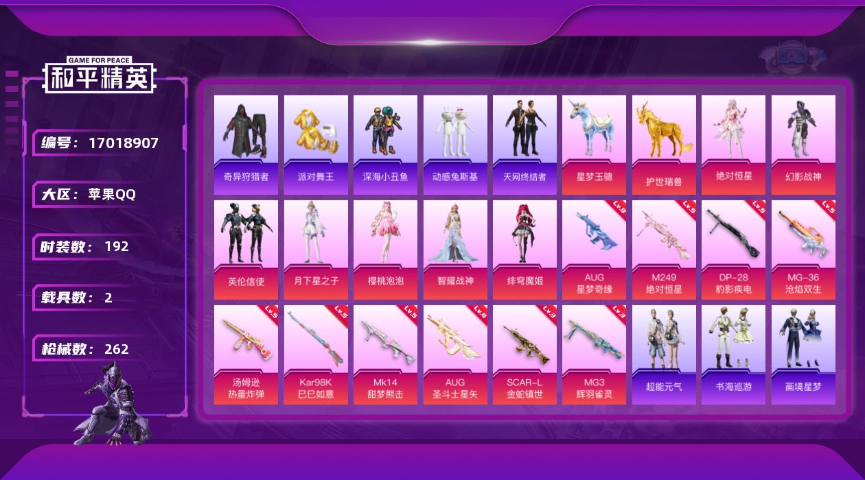 [17018907]苹果 手Q-7粉装-13特效枪-2载具-8粉色飞行器-81229热力值-8王牌印记-192套装-262枪皮 【热门品类】:套装-浪漫天命,套装-派对舞王,套装-深海小丑鱼,套装-奇异狩猎者,套装-天网终结者,套装-忍者信条,套装-动感兔斯基人偶服,角色-六号稻草人 【粉色套装】:角色-绝对恒星,粉装-幻影战神,粉装-英伦信使,角色-月下星之子,角色-樱桃泡泡,角色-智耀战神,角色-绯穹魔姬 【粉色枪皮等级】:SCAR-L-金蛇镇世(三级),AUG-星梦奇缘(九级),AUG-圣斗士星矢(四级),ACE32-绿头鱼(五级),汤姆逊-热量炸弹(五级),AKS-74U-森灵之息(五级),Kar98K-巳巳如意(五级),Mk14-甜梦熊击(五级),M249-绝对恒星(五级),DP-28-豹影疾电(五级),MG3-辉羽雀灵(三级),MG-36-沧焰双生(五级) 【粉色载具】:星梦玉骢,护世瑞兽 【粉色枪皮】:SCAR-L-金蛇镇世,AUG-星梦奇缘,AUG-圣斗士星矢,ACE32-绿头鱼,汤姆逊-热量炸弹,AKS-74U-森灵之息,Kar98K-巳巳如意,Mk14-甜梦熊击,Mk14-福马献瑞,M249-绝对恒星,DP-28-豹影疾电,MG3-辉羽雀灵,MG-36-沧焰双生 【粉色飞行器】:绝对恒星飞行器,炫彩糖果飞行器,凤舞九天飞行器,万象金身飞行器,圣域金龙飞行器,绯果甜心飞行器,终晖之翼飞行器,飞天猪飞行器 【粉色降落伞】:绝对恒星降落伞,甜心宝贝降落伞,阿狸红降落伞,香水柠檬降落伞,镜域双华降落伞,星梦奇缘降落伞,临安公主降落伞,动力核心降落伞,金蛇镇世降落伞,鬼刀降落伞,晶梦幻蝶降落伞,月下星之子降落伞,樱桃泡泡降落伞,桃粉嫣然降落伞,圣辉之星降落伞,智耀战神降落伞,幻彩电音降落伞,异瞳寒姬降落伞,极意拳锋降落伞,炫彩糖果降落伞 【稀有套装】:套装-绒宝小鹅,套装-巳巳如意,套装-暖暖向日葵,套装-超能元气,角色-超感刻度,角色-甜心蒙太奇,套装-雪国风尚,套装-炫彩糖果,套装-先驱飞行员,角色-怀庆长公主,角色-光矢逐梦,套装-燕燕于飞,套装-鱼渊荷华,角色-海琴烟,套装-晶辉守护,套装-绒兔团圆,角色-蜜桃派对,角色-琉璃花蕾,套装-风舞幻音,套装-樱梦幻音,角色-幽秘之星,角色-冷霜之星,套装-粉恋花,套装-紫幽梦,套装-蓝冰羽,角色-猎影月神,角色-瑰梦爱神