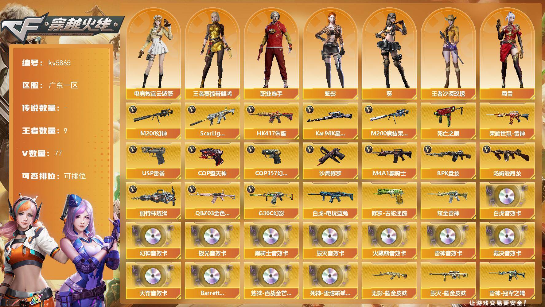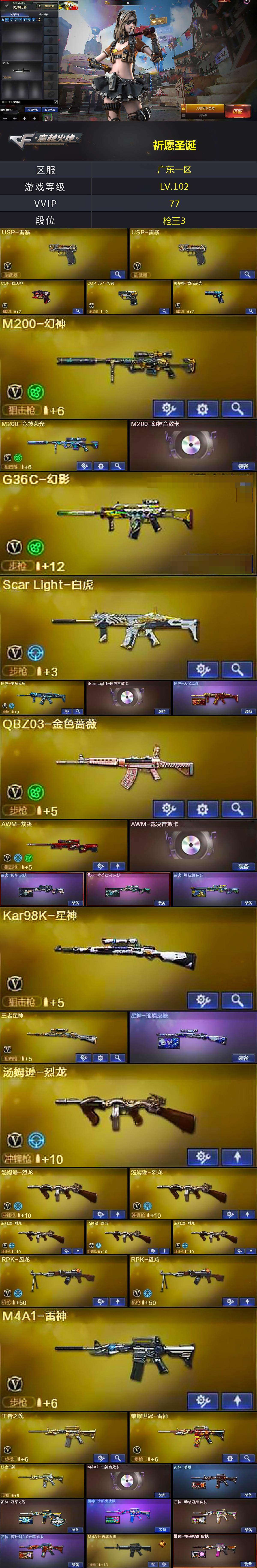 [17019532]广东一区-81V-9王者武器数-1炫金武器数 【热门武器】:G36C-幻影,QBZ03-金色蔷薇,Scar Light-白虎,HK417-朱雀,M200-幻神,修罗-古蛇迷踪,M200-竞技荣光,死亡之眼,荣耀世冠-雷神,白虎-电玩蓝兔,Kar98K-星神,M4A1-黑骑士,汤姆逊-烈龙*6,RPK-盘龙*2,加特林-炼狱,USP-雷暴*2,COP-堕天神,COP 357-幻灵,沙鹰-修罗 【王者炫金武器】:炫金雷神 【音效卡】:M200-幻神音效卡,AK47-火麒麟音效卡,M4A1-雷神音效卡,M4A1-黑骑士音效卡,Barrett-毁灭音效卡,Barrett-极光音效卡,AWM-裁决音效卡,Scar Light-白虎音效卡,QBZ03-天罚音效卡,Barrett-碧霄极光音效卡,炼狱-百战金芒-庆典舞曲音效卡,死神-雪域霜狐-怀旧音效卡 【皮肤】:白虎-大汉风骨,裁决-羽掣 皮肤,裁决-叶芒苍灵 皮肤,裁决-运输船 皮肤,星神-璀璨皮肤,雷神-暗月,雷神-冠军之魄,雷神-宇航兔皮肤,雷神-动感闪耀 皮肤,雷神-源计划2.0专属 皮肤,M4A1-再燃火线,雷神-神秘按键 皮肤,火麒麟-平天大圣,火麒麟-心动糖果,毁灭-暗月,毁灭耀金皮肤,毁灭-黑大圣皮肤,毁灭-英雄计划 皮肤,黑骑士-暗月,无影耀金皮肤,黑武士-典韦皮肤,极光-能量核心,轻型军用手斧-再燃火线,龙啸-幻灵之哮 皮肤,麒麟刺-量子聚变 皮肤 【角色】:葵,魅影,电竞教官-云悠悠,战地猎狐,王者葵-惊若翩鸿,王者沙漠玫瑰,雪域霜狐,蛇隐宗,修道士,云海玲珑,暗夜-X,初恋灵狐,飞虎队-X,风暴女*2,娟娟,灵狐者-X,灵狐者-黄金海岸,灵狐者-七夕宝贝,龙儿,潘多拉-甜心教官,潜龙队-X,蛇姬,蜀雪,铁骑荣耀,兔囡囡,雪莉杨,雪莉杨-摸金校尉,影武者-X,职业选手 【人偶武器】:火麒麟-灵狐,迷你深渊冰龙,迷你裂空之翼*2,迷你牛魔王,迷你火种,迷你生化手雷*2,生化手雷-机甲核心*2,灵狐娃娃手雷 【暴走生化】:死亡之眼 【挑战大师】:AK47-冰龙粉碎者,冰龙粉碎者-白马银枪,激光毁灭者III,神圣爆裂者-末日III*2,阐释者III 【英雄级武器】:AK47-火麒麟*3,M4A1-雷神,M4A1-黑骑士,AK47-无影,AK47-黑武士,AK47-黑鲨,HK417-朱雀,Scar Light-