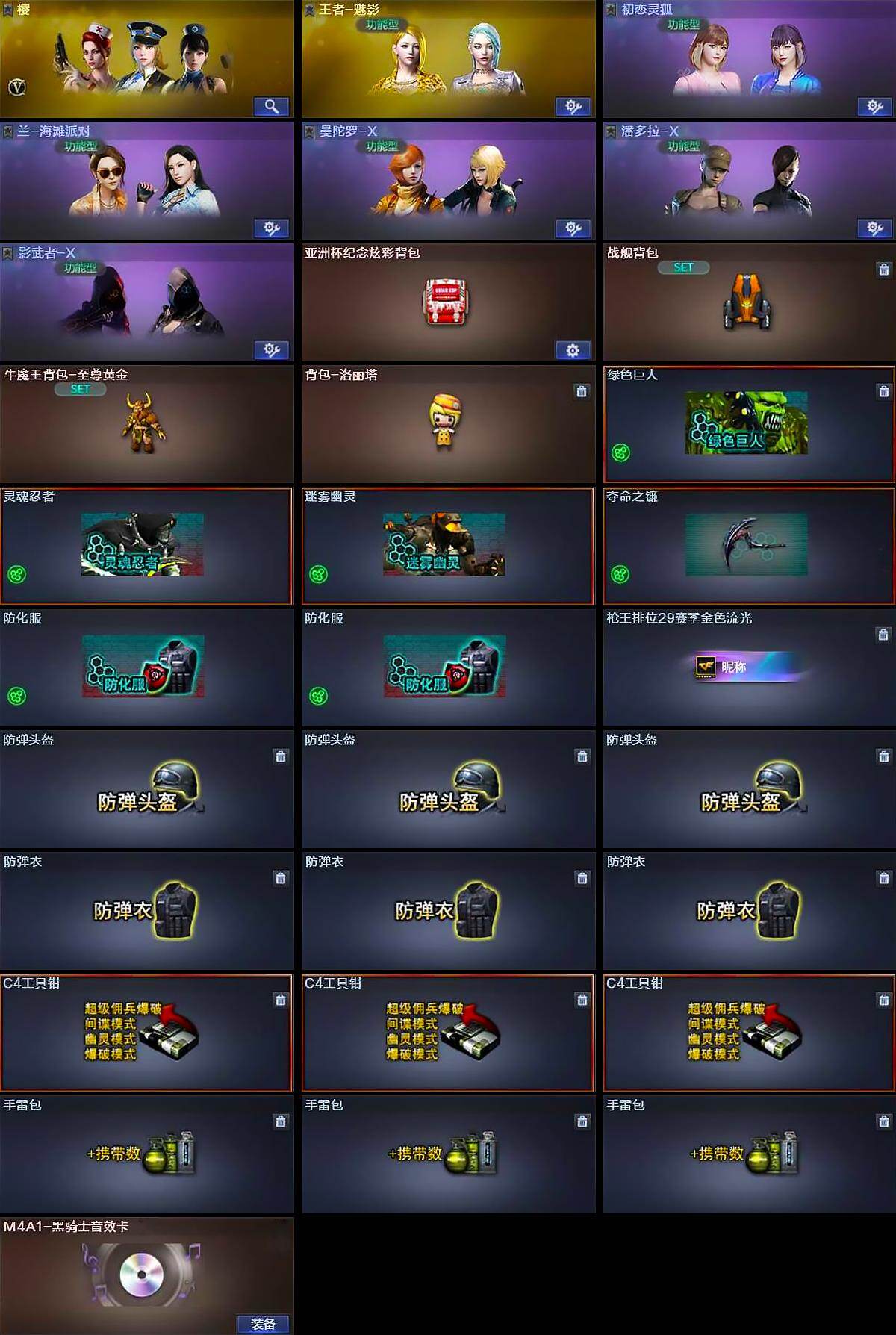 【道具】:亚洲杯纪念炫彩背包,战舰背包,牛魔王背包-至尊黄金,背包-洛丽塔,绿色巨人,灵魂忍者,迷雾幽灵,夺命之镰,防化服*2,枪王排位29赛季金色流光,防弹头盔*3,防弹衣*3,C4工具钳*3,手雷包*3