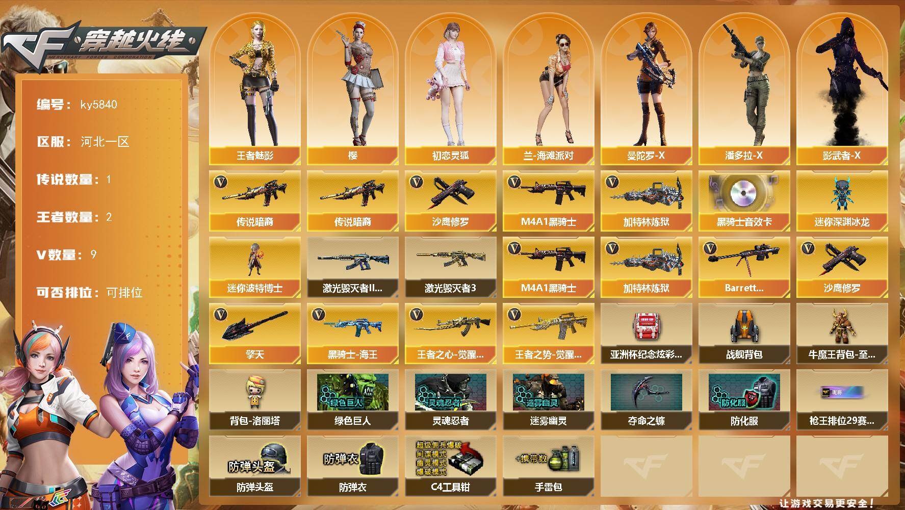 [17020819]河北一区-11V-2王者武器数-0炫金武器数 【传说武器】:传说暗裔 【热门武器】:传说暗裔,M4A1-黑骑士,加特林-炼狱,沙鹰-修罗*2 【音效卡】:M4A1-黑骑士音效卡 【角色】:樱,王者-魅影,初恋灵狐,兰-海滩派对,曼陀罗-X,潘多拉-X,影武者-X 【人偶武器】:迷你深渊冰龙*2,迷你波特博士*2 【挑战大师】:激光毁灭者III-白马银枪,激光毁灭者III 【英雄级武器】:M4A1-黑骑士,王者之心-觉醒版,王者之势-觉醒版,黑骑士-海王,Barrett-毁灭,加特林-炼狱,沙鹰-修罗*2,擎天 【道具】:亚洲杯纪念炫彩背包,战舰背包,牛魔王背包-至尊黄金,背包-洛丽塔,绿色巨人,灵魂忍者,迷雾幽灵,夺命之镰,防化服*2,枪王排位29赛季金色流光,防弹头盔*3,防弹衣*3,C4工具钳*3,手雷包*3 【特殊枪械】:1黑骑士,1炼狱