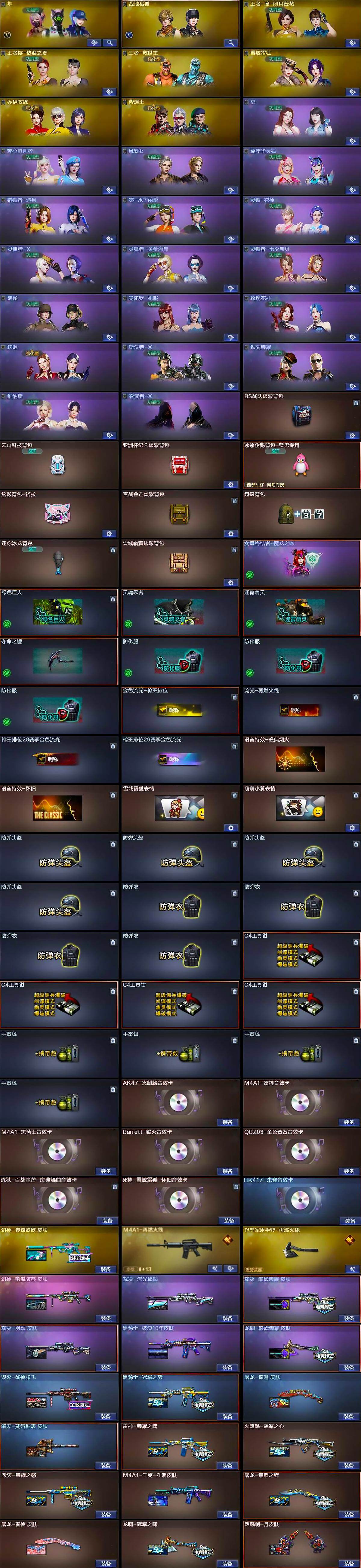 【音效卡】:AK47-火麒麟音效卡,M4A1-雷神音效卡,M4A1-黑骑士音效卡,Barrett-毁灭音效卡,QBZ03-金色蔷薇音效卡,HK417-朱雀音效卡,炼狱-百战金芒-庆典舞曲音效卡,死神-雪域霜狐-怀旧音效卡
