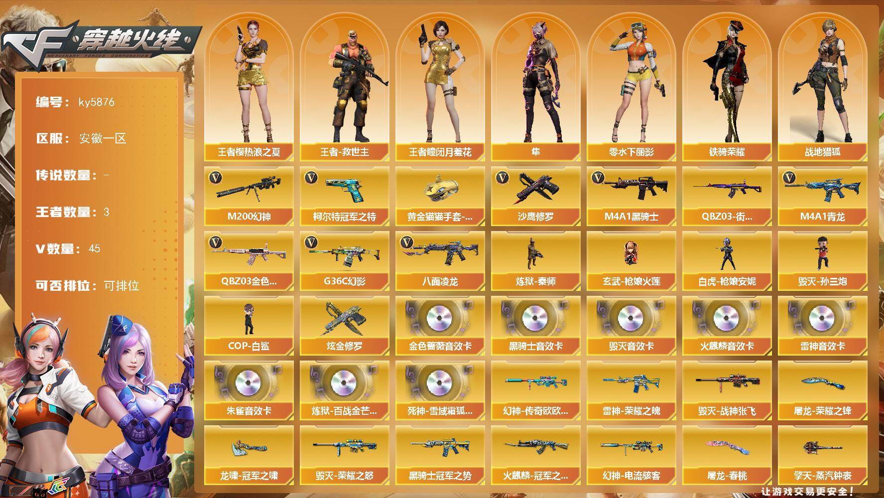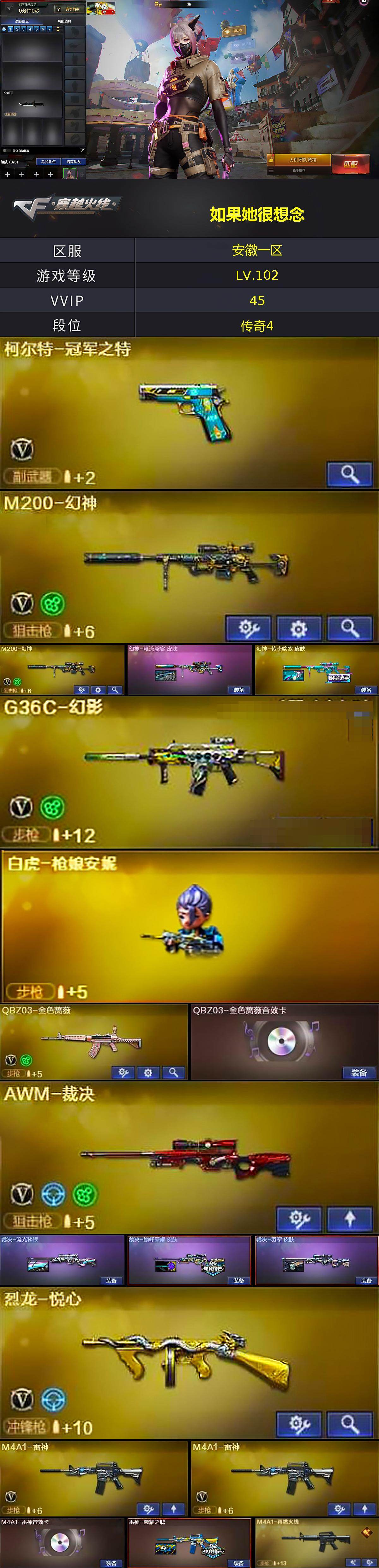 [17020841]安徽一区-47V-3王者武器数-1炫金武器数 【热门武器】:G36C-幻影,QBZ03-金色蔷薇,M4A1-青龙,M200-幻神*2,八面凌龙,QBZ03-街机,柯尔特-冠军之特,M4A1-黑骑士*3,炼狱-秦师,玄武-枪娘火莲,白虎-枪娘安妮,毁灭-孙三炮,COP-白鲨,沙鹰-修罗,黄金猫猫手套-白鲨 【王者炫金武器】:炫金修罗 【音效卡】:AK47-火麒麟音效卡,M4A1-雷神音效卡,M4A1-黑骑士音效卡,Barrett-毁灭音效卡,QBZ03-金色蔷薇音效卡,HK417-朱雀音效卡,炼狱-百战金芒-庆典舞曲音效卡,死神-雪域霜狐-怀旧音效卡 【皮肤】:幻神-电流骇客 皮肤,幻神-传奇欧欧 皮肤,裁决-流光秘银,裁决-巅峰荣耀 皮肤,裁决-羽掣 皮肤,雷神-荣耀之魄,M4A1-再燃火线,火麒麟-冠军之心,毁灭-荣耀之怒,毁灭-战神张飞,毁灭-英雄计划 皮肤,M4A1-千变-孔明皮肤,黑骑士-冠军之势,黑骑士-破浪10年皮肤,屠龙-荣耀之锋,屠龙-春桃 皮肤,屠龙-惊鸿 皮肤,龙啸-冠军之啸,龙啸-巅峰荣耀 皮肤,轻型军用手斧-再燃火线,擎天-蒸汽钟表 皮肤,麒麟刺-月皮肤 【角色】:隼,战地猎狐,王者-瞳-闭月羞花,王者樱-热浪之夏,王者-救世主,雪域霜狐,乔伊教练,修道士,空,芳心审判者,风暴女,嘉年华灵狐,猎狐者-追月,零-水下丽影,灵狐-花神,灵狐者-X,灵狐者-黄金海岸,灵狐者-七夕宝贝,麻雀,曼陀罗-礼服,玫瑰花神,蛇姬,斯沃特-X,铁骑荣耀,兔囡囡,维纳斯,影武者-X,智影 【人偶武器】:玄武-枪娘火莲,炼狱-秦师,COP-白鲨,毁灭-孙三炮,白虎-枪娘安妮,HK417-朱雀-枪娘菲,超新星-枪娘安琪儿,金色蔷薇-枪娘阿敏,星神-枪娘默,斯泰尔-枪娘暗刃,AWM-灵狐-15周年嘉年华,迷你深渊冰龙,迷你裂空之翼*2,迷你波特博士,迷你曼提柯尔,迷你牛牛,迷你火种,生化手雷-机甲核心 【挑战大师】:神圣爆裂者III*2,冰龙粉碎者-白马银枪,激光毁灭者III-白马银枪,VEPR-12-金魔,机甲撕裂者III,试炼破坏者III,KAC-圣炎切割者III,神圣爆裂者-末日III,阐释者III*2 【英雄级武器】:AK47-火麒麟,M4A1-雷神*2,M4A1-黑骑士*3,M4A1-青龙,无影-神兵利器,G36C-幻影,八面凌龙,死神-雪域霜狐,QBZ0