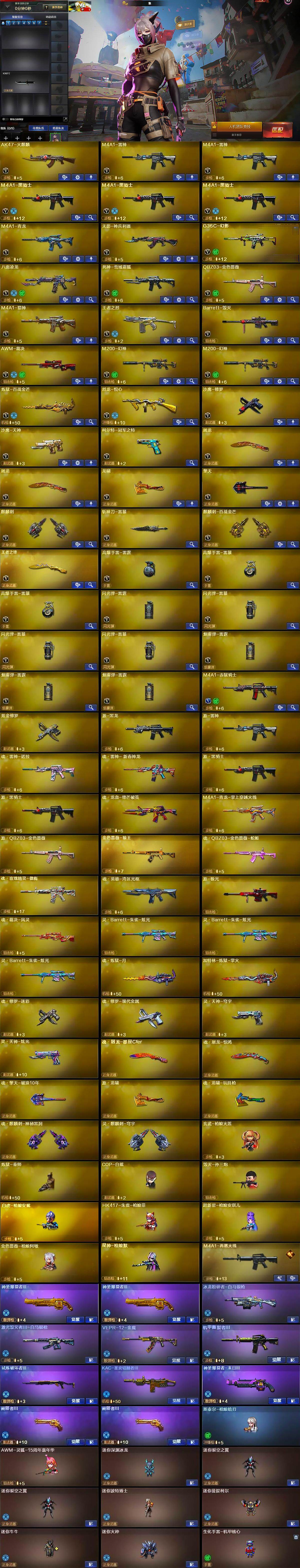 【热门武器】:G36C-幻影,QBZ03-金色蔷薇,M4A1-青龙,M200-幻神*2,八面凌龙,QBZ03-街机,柯尔特-冠军之特,M4A1-黑骑士*3,炼狱-秦师,玄武-枪娘火莲,白虎-枪娘安妮,毁灭-孙三炮,COP-白鲨,沙鹰-修罗,黄金猫猫手套-白鲨