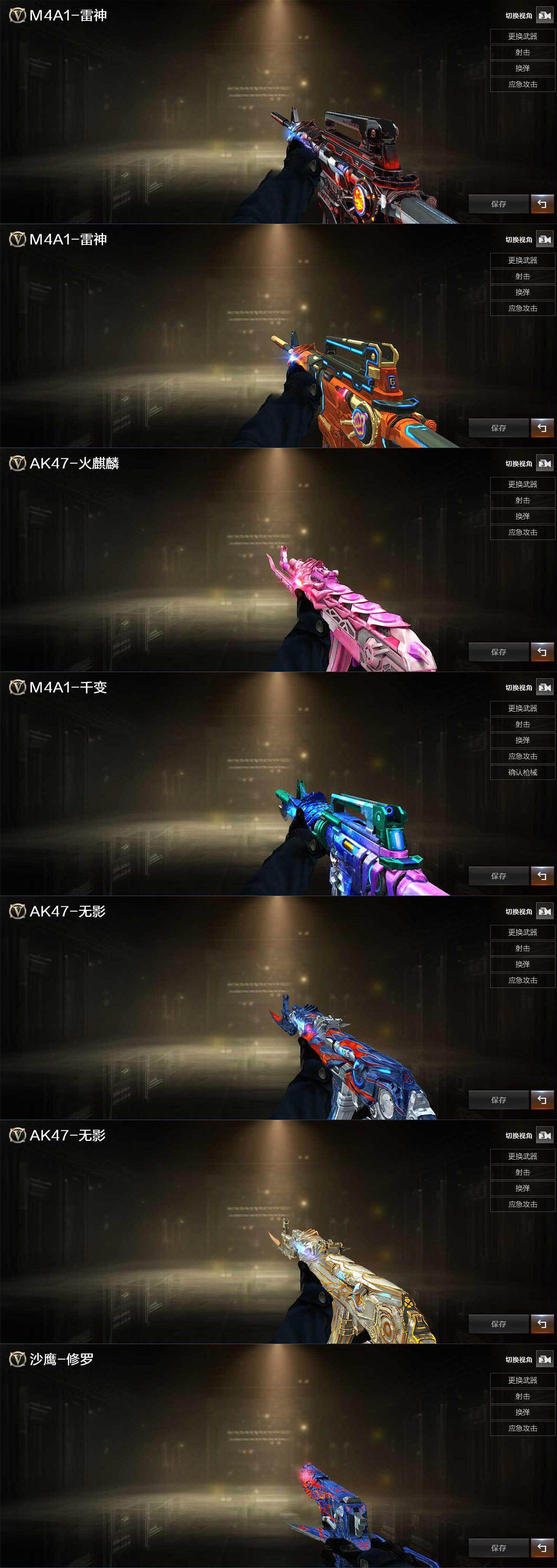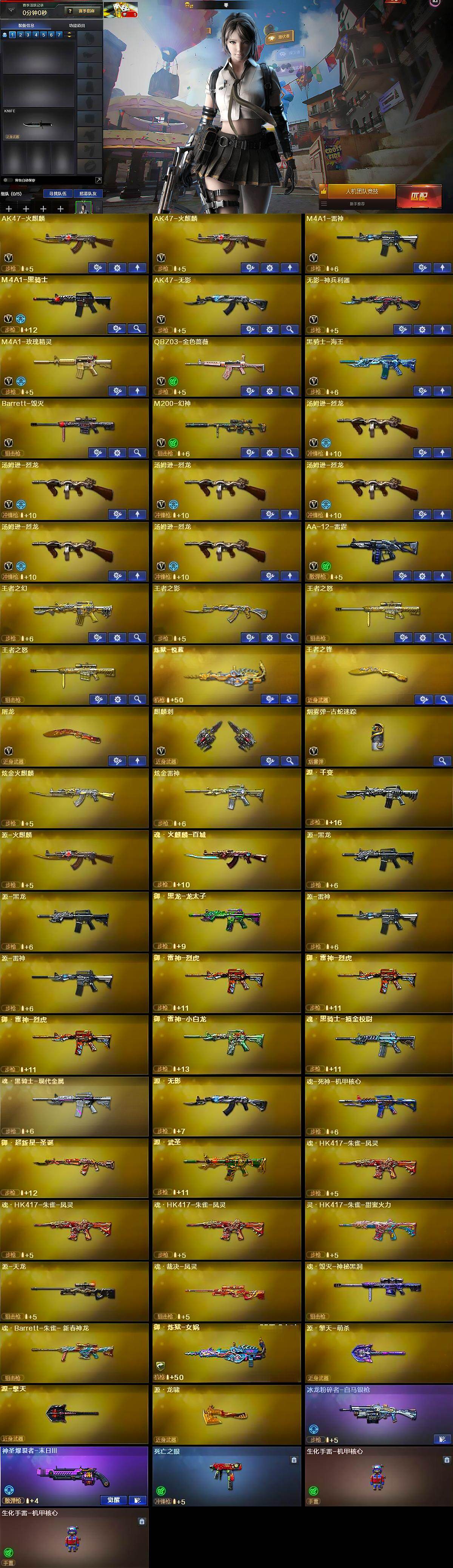 【英雄级武器】:AK47-火麒麟*2,M4A1-雷神,M4A1-黑骑士,AK47-无影,无影-神兵利器,M4A1-玫瑰精灵,QBZ03-金色蔷薇,黑骑士-海王,Barrett-毁灭,M200-幻神,汤姆逊-烈龙*6,AA-12-雷霆,屠龙,麒麟刺,烟雾弹-古蛇迷踪