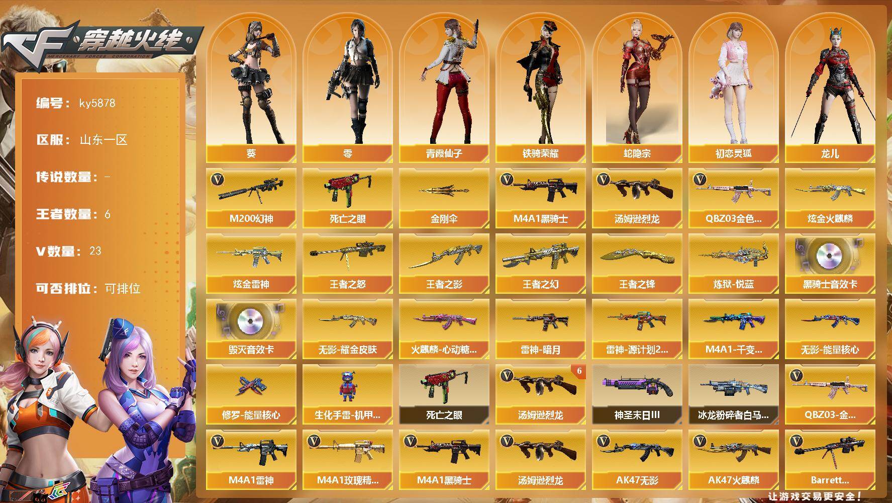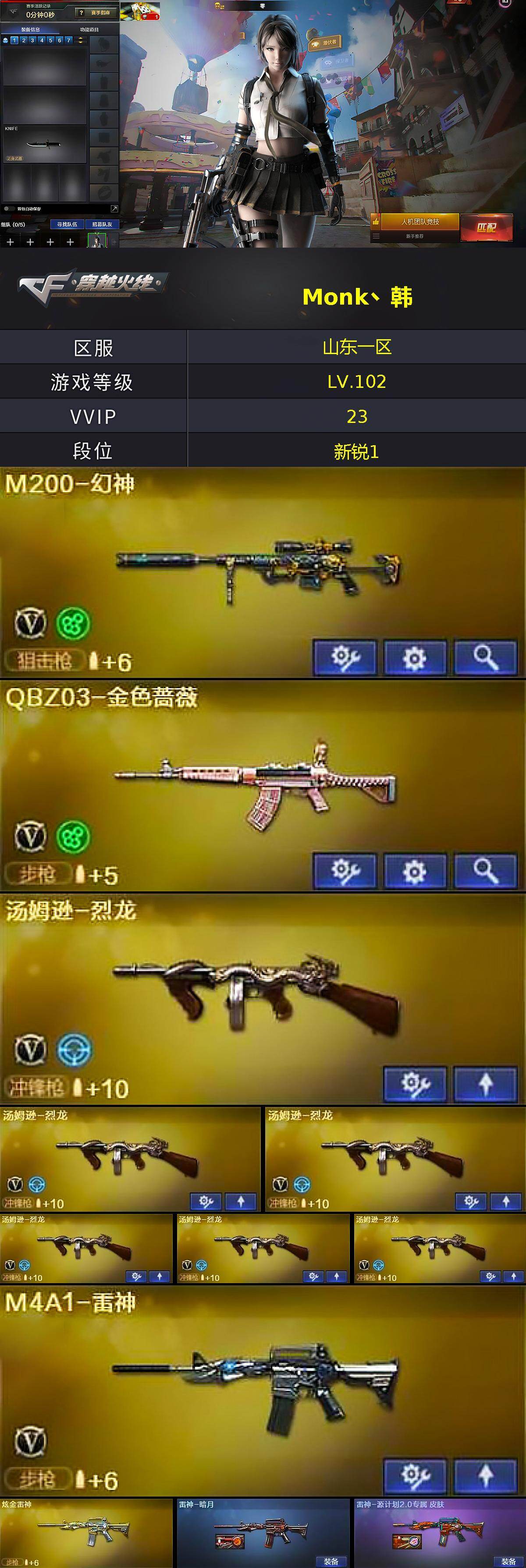 [17020929]山东一区-22V-6王者武器数-2炫金武器数 【热门武器】:QBZ03-金色蔷薇,M200-幻神,死亡之眼,M4A1-黑骑士,汤姆逊-烈龙*6,金刚伞 【王者炫金武器】:王者之幻,王者之影,王者之怒*2,炼狱-悦蓝,王者之锋,炫金火麒麟,炫金雷神 【音效卡】:M4A1-黑骑士音效卡,Barrett-毁灭音效卡 【皮肤】:雷神-暗月,雷神-源计划2.0专属 皮肤,火麒麟-心动糖果,M4A1-千变-孔明皮肤,无影-能量核心,无影耀金皮肤,修罗-能量核心*2 【角色】:零,葵,蛇隐宗,初恋灵狐,龙儿,青霞仙子,蛇姬,斯沃特-X,铁骑荣耀,维纳斯,夜玫瑰-宠粉,影武者-X 【人偶武器】:生化手雷-机甲核心*2 【暴走生化】:死亡之眼 【挑战大师】:冰龙粉碎者-白马银枪,神圣爆裂者-末日III 【英雄级武器】:AK47-火麒麟*2,M4A1-雷神,M4A1-黑骑士,AK47-无影,无影-神兵利器,M4A1-玫瑰精灵,QBZ03-金色蔷薇,黑骑士-海王,Barrett-毁灭,M200-幻神,汤姆逊-烈龙*6,AA-12-雷霆,屠龙,麒麟刺,烟雾弹-古蛇迷踪 【道具】:战舰背包,绿色巨人,灵魂忍者,变异宝贝,迷雾幽灵,夺命之镰,防化服*2,枪王排位28赛季金色流光,防弹头盔*6,防弹衣*7,C4工具钳*7,手雷包*5 【特殊枪械】:1黑骑士,6烈龙