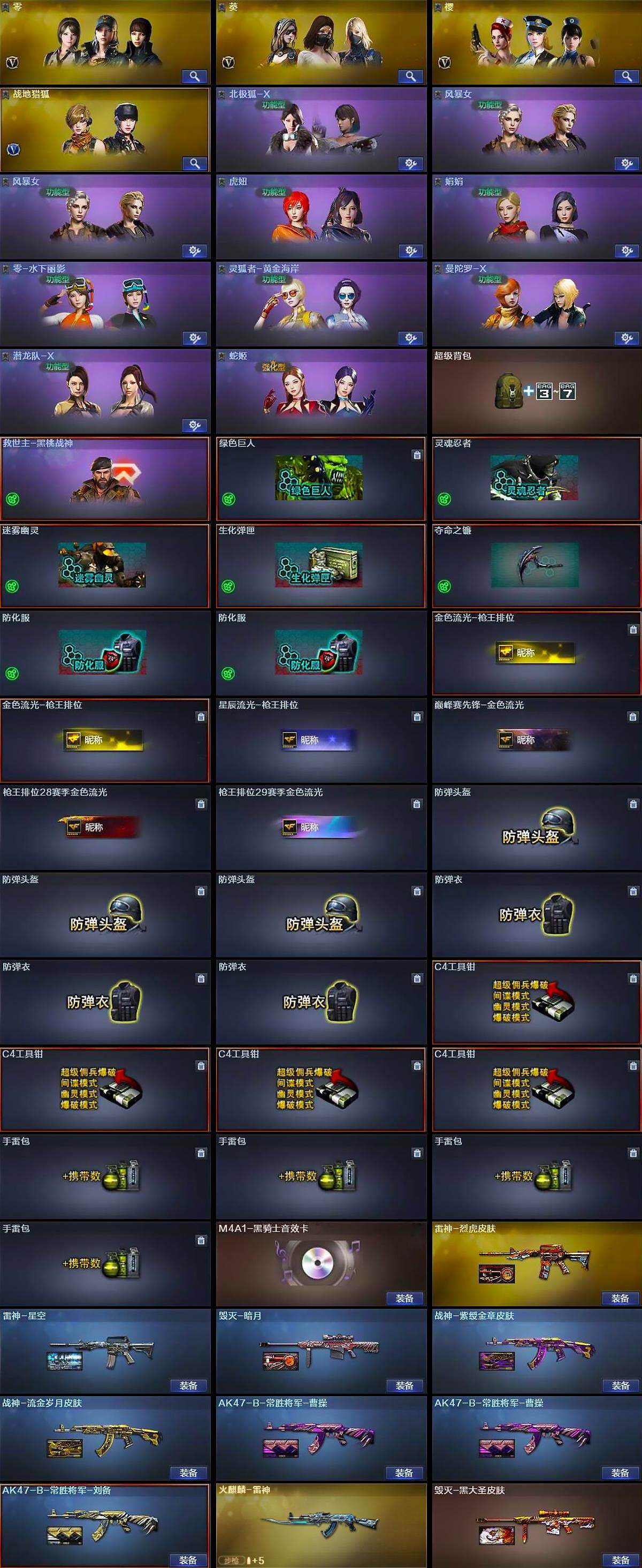 【道具】:超级背包,救世主-黑桃战神,绿色巨人,灵魂忍者,迷雾幽灵,生化弹匣,夺命之镰,防化服*2,金色流光-枪王排位*2,星辰流光-枪王排位,巅峰赛先锋-金色流光,枪王排位28赛季金色流光,枪王排位29赛季金色流光,防弹头盔*3,防弹衣*3,C4工具钳*4,手雷包*4