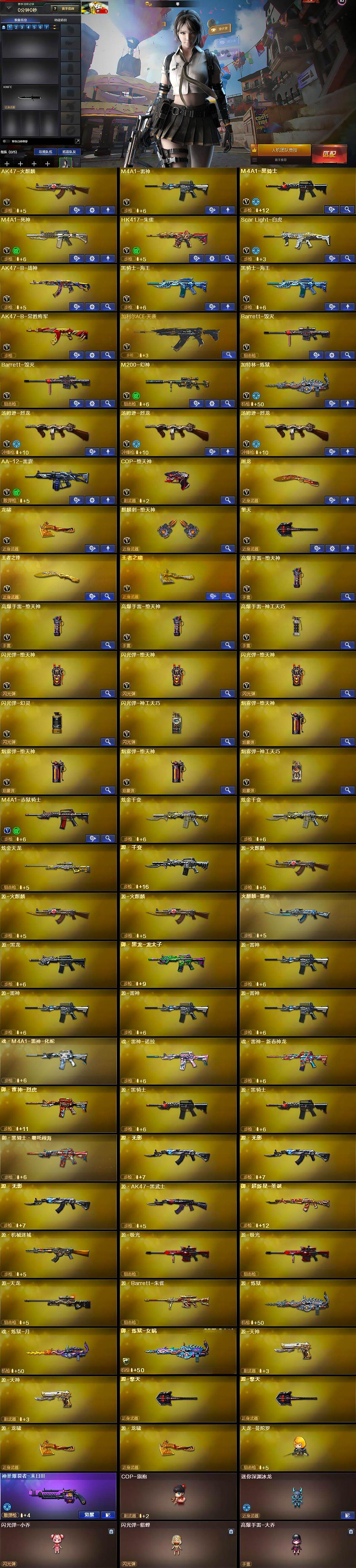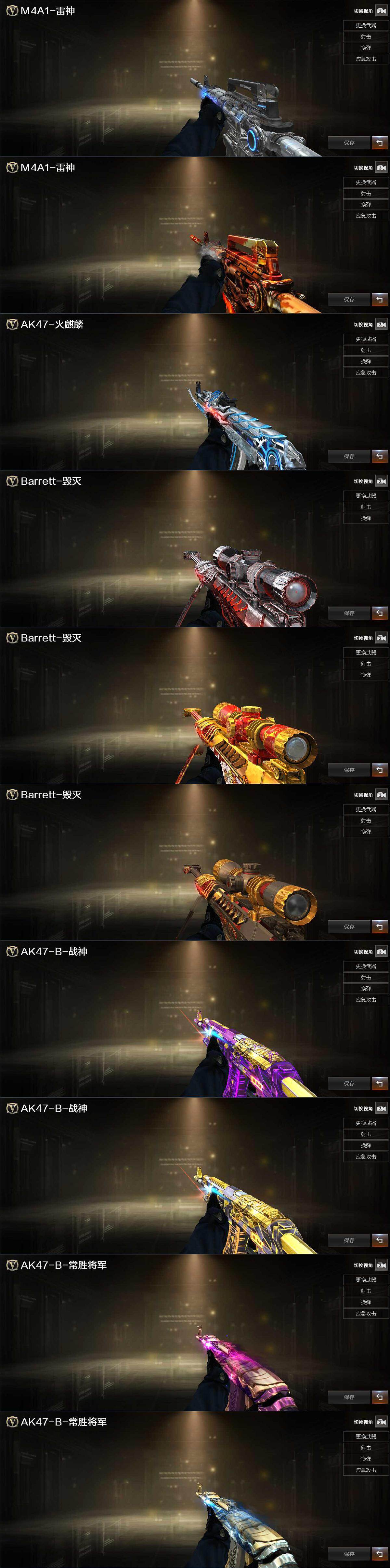 【英雄级武器】:AK47-火麒麟,M4A1-雷神,M4A1-黑骑士,M4A1-死神,HK417-朱雀,Scar Light-白虎,AK47-B-战神,黑骑士-海王*2,AK47-B-常胜将军,加利尔ACE-天袭,Barrett-毁灭*2,M200-幻神,加特林-炼狱,汤姆逊-烈龙*3,AA-12-雷霆,COP-堕天神,屠龙,龙啸,麒麟刺-堕天神,擎天,王者之锋-觉醒版,王者之啸-觉醒版,高爆手雷-堕天神*3,高爆手雷-神工天巧,闪光弹-堕天神*3,闪光弹-幻灵,闪光弹-神工天巧,烟雾弹-堕天神*3,烟雾弹-神工天巧,M4A1-赤狱骑士