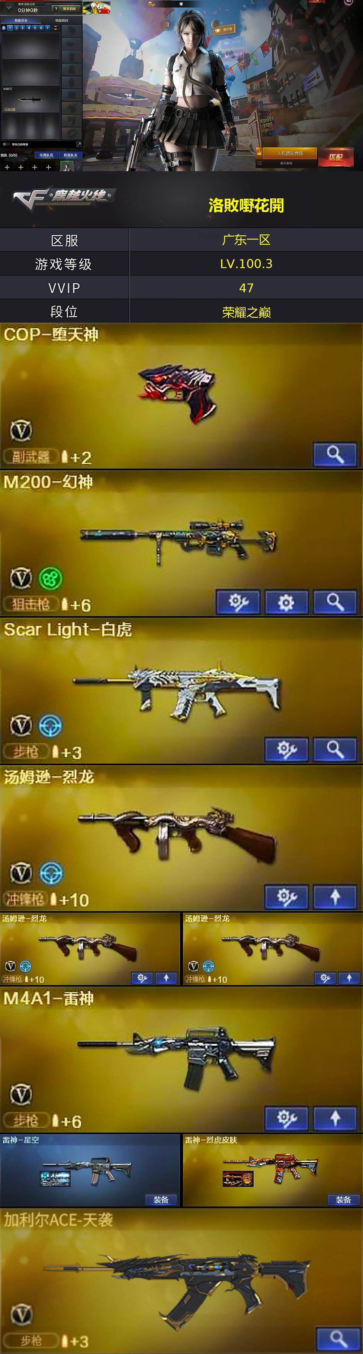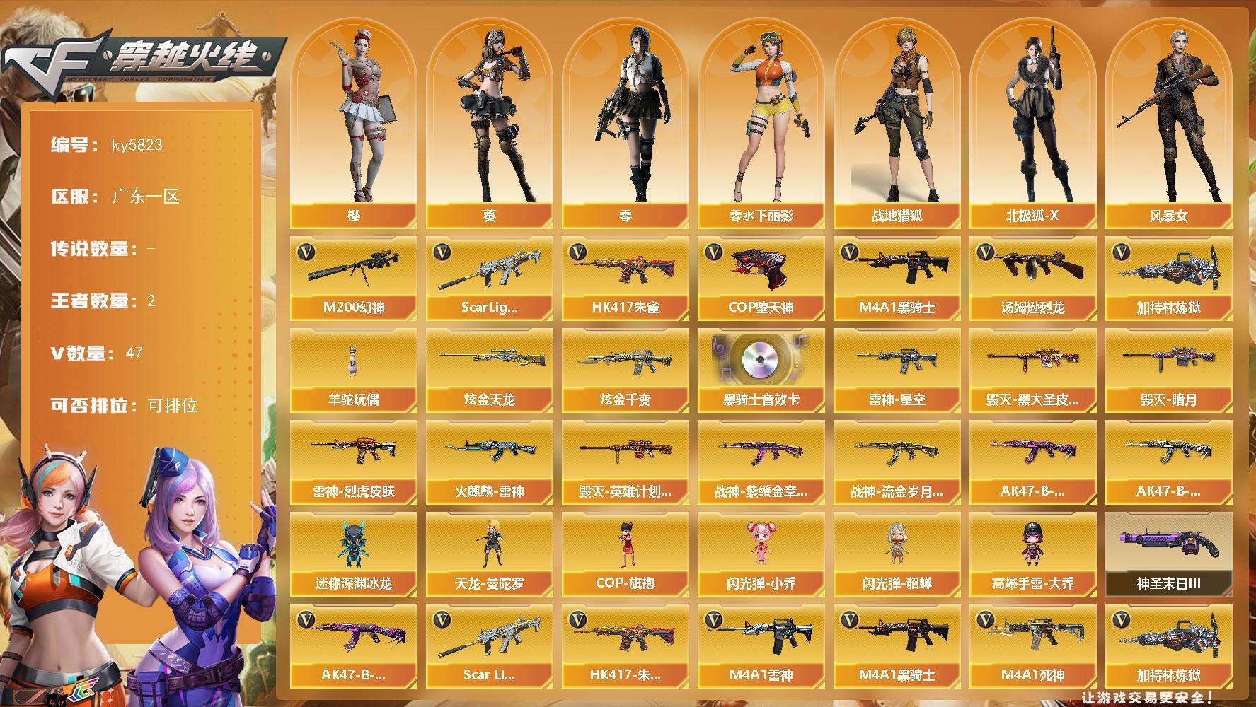 [17022203]广东一区-50V-2王者武器数-3炫金武器数 【热门武器】:Scar Light-白虎,HK417-朱雀,M200-幻神,M4A1-黑骑士,汤姆逊-烈龙*3,加特林-炼狱,羊驼玩偶,COP-堕天神 【王者炫金武器】:炫金千变*2,炫金天龙 【音效卡】:M4A1-黑骑士音效卡 【皮肤】:雷神-星空,雷神-烈虎皮肤,火麒麟-雷神,毁灭-暗月,毁灭-黑大圣皮肤,毁灭-英雄计划 皮肤,战神-紫绶金章皮肤,战神-流金岁月皮肤,AK47-B-常胜将军-曹操*2,AK47-B-常胜将军-刘备 【角色】:零,葵,樱,战地猎狐,北极狐-X,风暴女*2,虎妞,娟娟,零-水下丽影,灵狐者-黄金海岸,曼陀罗-X,潜龙队-X,蛇姬,兔囡囡 【人偶武器】:天龙-曼陀罗,COP-旗袍,迷你深渊冰龙,闪光弹-小乔,闪光弹-貂蝉,高爆手雷-大乔 【挑战大师】:神圣爆裂者-末日III 【英雄级武器】:AK47-火麒麟,M4A1-雷神,M4A1-黑骑士,M4A1-死神,HK417-朱雀,Scar Light-白虎,AK47-B-战神,黑骑士-海王*2,AK47-B-常胜将军,加利尔ACE-天袭,Barrett-毁灭*2,M200-幻神,加特林-炼狱,汤姆逊-烈龙*3,AA-12-雷霆,COP-堕天神,屠龙,龙啸,麒麟刺-堕天神,擎天,王者之锋-觉醒版,王者之啸-觉醒版,高爆手雷-堕天神*3,高爆手雷-神工天巧,闪光弹-堕天神*3,闪光弹-幻灵,闪光弹-神工天巧,烟雾弹-堕天神*3,烟雾弹-神工天巧,M4A1-赤狱骑士 【道具】:超级背包,救世主-黑桃战神,绿色巨人,灵魂忍者,迷雾幽灵,生化弹匣,夺命之镰,防化服*2,金色流光-枪王排位*2,星辰流光-枪王排位,巅峰赛先锋-金色流光,枪王排位28赛季金色流光,枪王排位29赛季金色流光,防弹头盔*3,防弹衣*3,C4工具钳*4,手雷包*4 【特殊枪械】:1白虎,1黑骑士,3烈龙,1炼狱