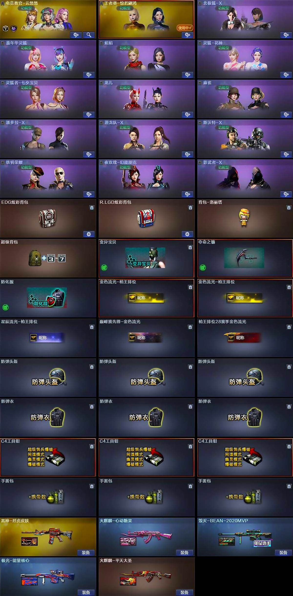 【道具】:EDG炫彩背包,R.LGD炫彩背包,背包-洛丽塔,超级背包,变异宝贝,夺命之镰,防化服,金色流光-枪王排位*2,星辰流光-枪王排位,巅峰赛先锋-金色流光,枪王排位28赛季金色流光,防弹头盔*3,防弹衣*3,C4工具钳*3,手雷包*3