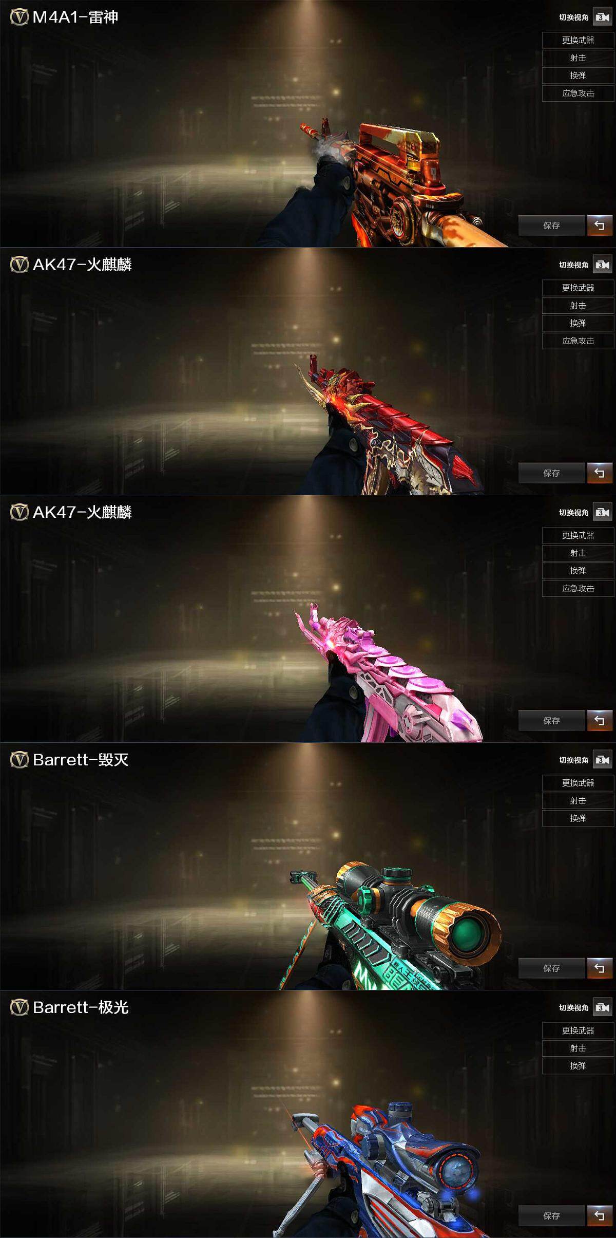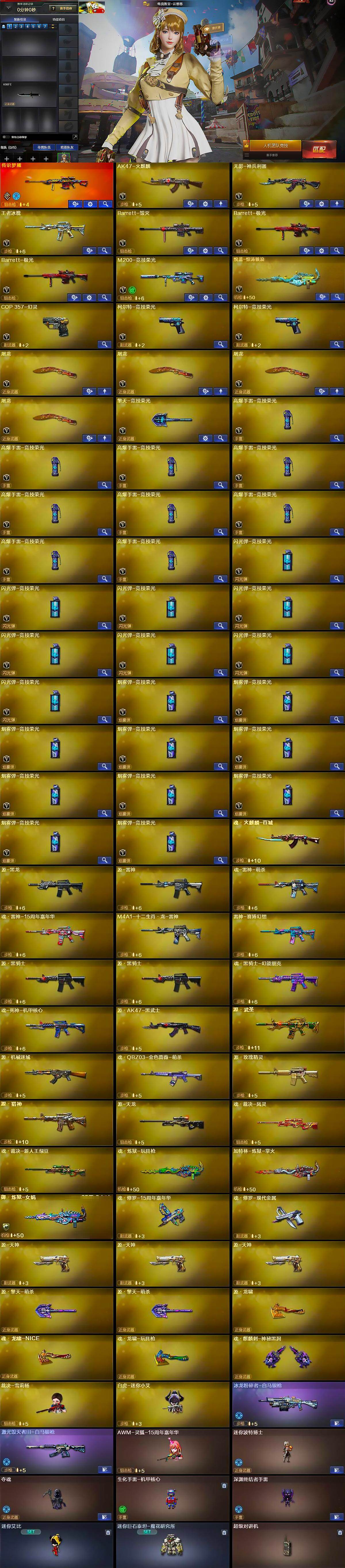 【英雄级武器】:AK47-火麒麟,无影-神兵利器,王者冰魄-觉醒版,Barrett-毁灭,Barrett-极光*2,M200-竞技荣光,悦蓝-惊涛骇浪-觉醒版,COP 357-幻灵,柯尔特-竞技荣光*2,屠龙*4,擎天-竞技荣光,高爆手雷-竞技荣光*9,闪光弹-竞技荣光*8,烟雾弹-竞技荣光*10