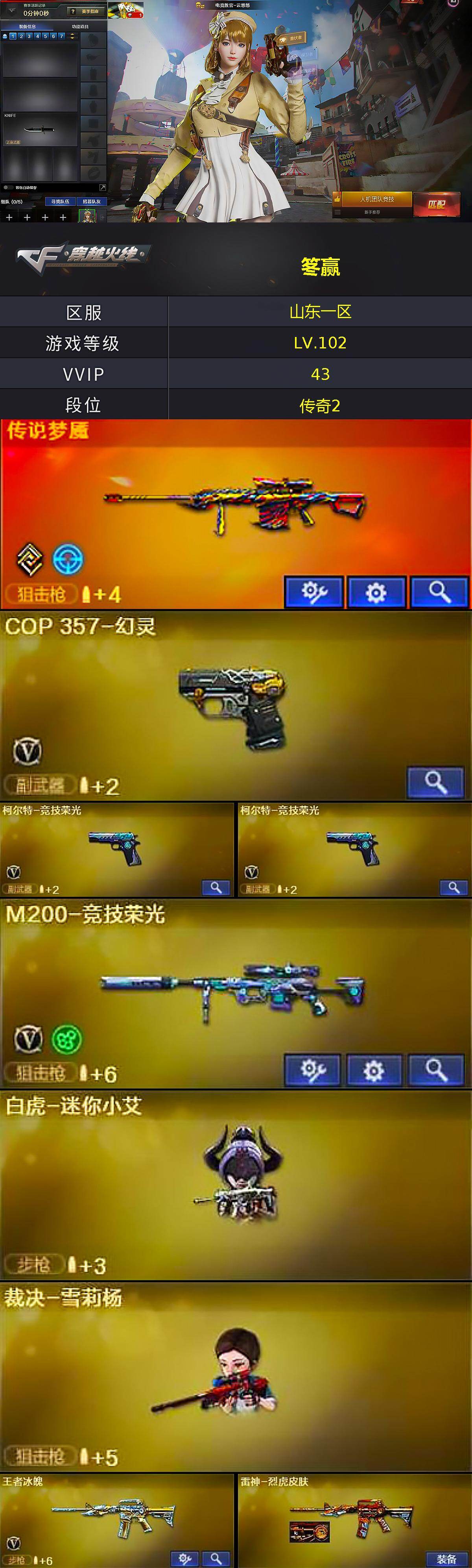 - [12308392]【商品标题】:江西一区-43V-1王者-0炫金 【传说武器】:传说夜影,传说破晓 【传说角色】:传说艾莉莎 【热门武器】:传说夜影,传说破晓,QBZ03-金色蔷薇,修罗-古蛇迷踪,Cat-刀锋,M4A1-黑骑士,汤姆逊-烈龙*6,COP-白鲨,沙鹰-修罗*5 【音效卡】:AWM-裁决音效卡 【稀有皮肤】:Kar98K-星神-冠军之星皮肤,白虎-AG-CFPLS20冠军,QBZ03-AG-CFPLS19冠军,雷神-冠军之魄,火麒麟-轻羽皮肤,火麒麟-巅峰荣耀,屠龙-春桃 皮肤 【角色】:传说艾莉莎,战地猎狐,暗黑审判,青霞仙子 【人偶武器】:COP-白鲨,AWM-灵狐-15周年嘉年华,M4A1-雷神-精英刀锋,Cat-刀锋,迷你超能女侍,生化手雷-机甲核心 【暴走生化】:超级对讲机 【挑战大师】:激光毁灭者III,激光毁灭者III-白马银枪,冰龙粉碎者-白马银枪 【英雄级武器】:柯尔特-竞技荣光,烈火-动感闪耀,天神-动感闪耀,屠龙-动感闪耀,手雷-动感闪耀,QBZ03-金色蔷薇,无影-神兵利器,M4A1-雷神,M4A1-黑龙,M4A1-黑骑士,汤姆逊-烈龙*6,AK47-火麒麟,AWM-裁决,黑武士-锦绣游龙,AWM-昌龙,M4A1-赤狱骑士,修罗-古蛇迷踪,沙鹰-修罗*5,麒麟刺,龙啸,屠龙*5 【特殊枪械】:1黑骑士,6烈龙