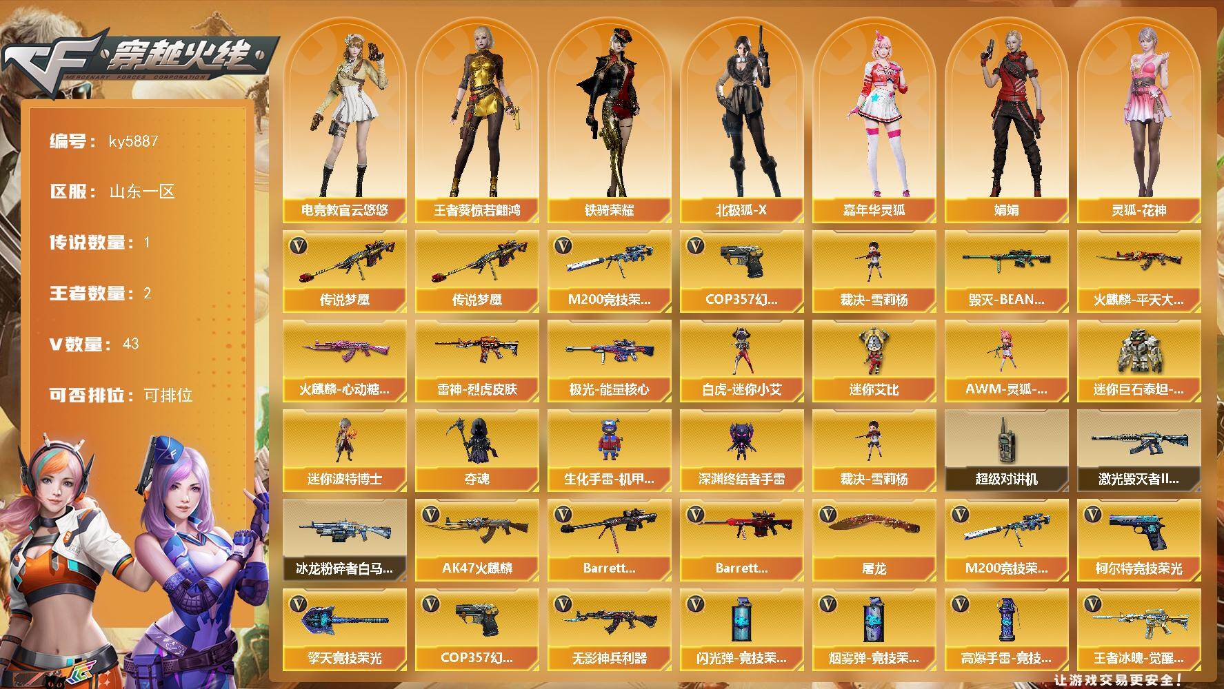 - [16063745]河南一区-28V-0王者-0炫金 【热门武器】:M200-竞技荣光,白虎-电玩蓝兔,C.A.T,M4A1-黑骑士,USP-雷暴 【音效卡】:M4A1-黑骑士音效卡,绝迹语音包 【皮肤】:雷神-宠儿-2019MVP,雷神-源计划2.0专属 皮肤,火麒麟-轻羽皮肤,火麒麟-平天大圣,火麒麟-心动糖果,毁灭-荣耀之怒,毁灭-黑大圣皮肤,毁灭-神秘黑洞皮肤,毁灭-英雄计划 皮肤,M4A1-千变-孔明皮肤,黑骑士-暗月,战神-粉色甜心皮肤,AK47-B-常胜将军-孙权,极光-能量核心,屠龙-荣耀之锋 【角色】:电竞教官-云悠悠,奇洋探员,北极狐-X,初恋灵狐,芳心审判者,飞虎队-X,风暴女*2,虎妞,嘉年华灵狐,灵狐者-X,灵狐者-七夕宝贝,麻雀,潘多拉-X,潜龙队-X,斯沃特-X,兔囡囡,游珑儿,职业选手 【人偶武器】:AWM-灵狐-15周年嘉年华,C.A.T,夺魂,生化手雷-机甲核心,迷你超能女侍 【暴走生化】:超级对讲机 【挑战大师】:冰龙粉碎者-白马银枪,激光毁灭者III-白马银枪*2,激光毁灭者III*3,神圣爆裂者-末日III 【英雄级武器】:M4A1-雷神,M4A1-黑骑士,无影-神兵利器,黑武士-锦绣游龙,超新星-热带奇洋,AK-47-猩红传说*2,白虎-电玩蓝兔,Barrett-毁灭,Barrett-极光,M200-竞技荣光,USP-雷暴,柯尔特-竞技荣光,屠龙,擎天-竞技荣光*2,龙啸-热带奇洋,高爆手雷-竞技荣光*4,手雷-热带奇洋,闪光弹-竞技荣光*3,烟雾弹-竞技荣光*3 【道具】:CFS限定背包,奇洋探员-海龟背包,热带奇洋炫彩背包,背包-洛丽塔,虎牙炫彩背包,超级背包,变异宝贝,生化弹匣,夺命之镰,防化服,金色流光-枪王排位*2,星辰流光-枪王排位,枪王排位28赛季金色流光,电玩兔兔表情,热带奇洋表情,EP战队名片,EP战队喷图,EP战队击杀图标,防弹头盔*3,防弹衣*2,C4工具钳*3,手雷包*2 【特殊枪械】:1黑骑士