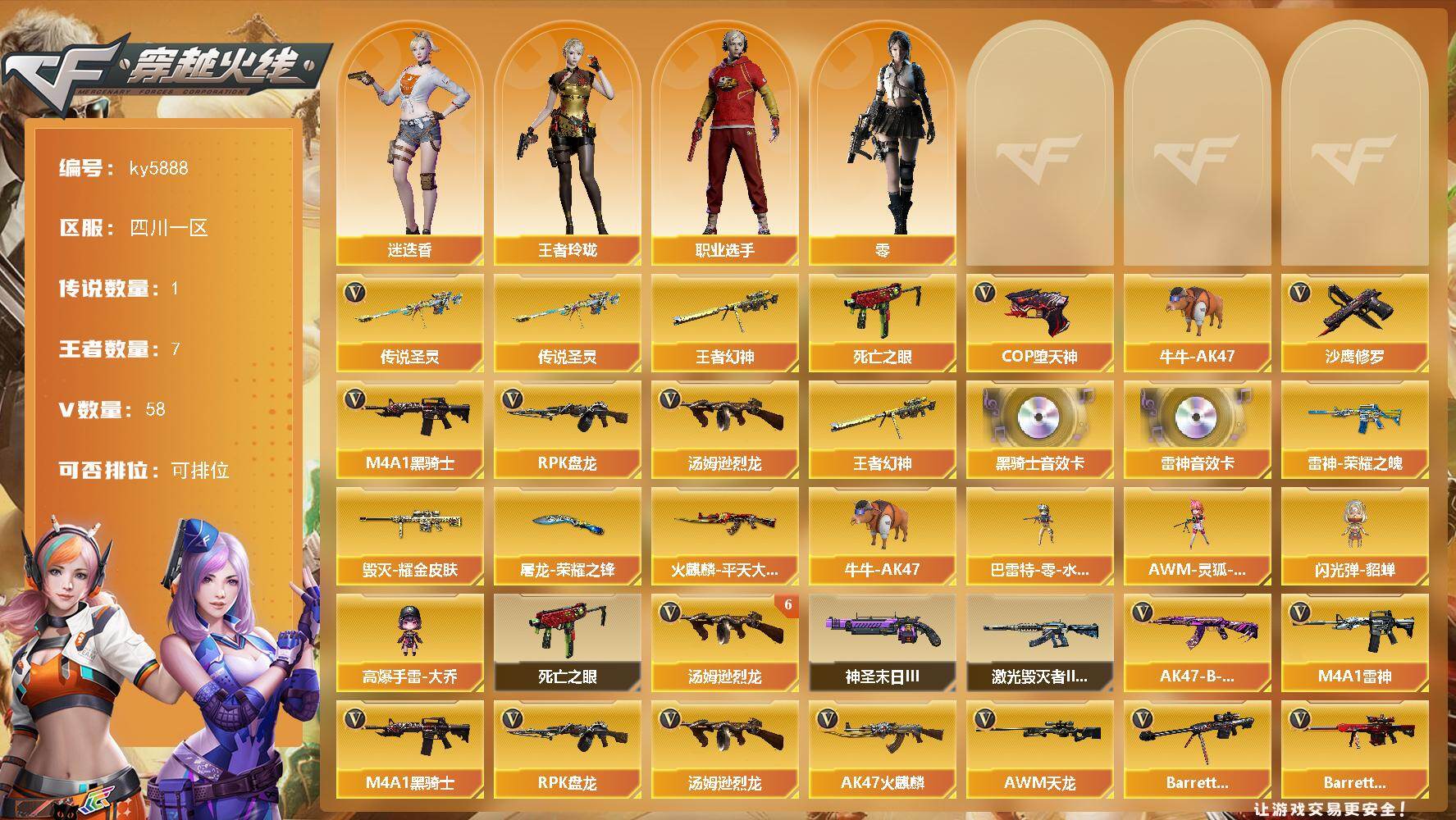 [17022620]四川一区-58V-7王者-0炫金 【传说武器】:传说圣灵 【热门武器】:传说圣灵,王者幻神,死亡之眼,牛牛-AK47,M4A1-黑骑士,汤姆逊-烈龙*6,RPK-盘龙,COP-堕天神,沙鹰-修罗 【王者炫金武器】:王者幻神 【音效卡】:M4A1-雷神音效卡,M4A1-黑骑士音效卡 【稀有皮肤】:雷神-荣耀之魄,火麒麟-平天大圣,毁灭耀金皮肤,屠龙-荣耀之锋 【角色】:王者玲珑,零,迷迭香,职业选手 【人偶武器】:巴雷特-零-水下丽影,AWM-灵狐-15周年嘉年华,牛牛-AK47,闪光弹-貂蝉,高爆手雷-大乔 【暴走生化】:死亡之眼 【挑战大师】:神圣爆裂者-末日III,激光毁灭者III-白马银枪 【英雄级武器】:擎天-竞技荣光,幻灵之锋,COP-堕天神,麒麟刺-堕天神*2,龙啸-堕天神*3,黑武士-CF网剧冠军*2,天神-CF网剧冠军*2,擎天-CF网剧冠军*2,手雷-动感闪耀,M4A1-雷神,M4A1-黑骑士,RPK-盘龙,汤姆逊-烈龙*6,AK47-火麒麟,AWM-天龙,Barrett-毁灭,Barrett-极光,AK-47-猩红传说,AK47-B-常胜将军,沙鹰-天神*2,沙鹰-修罗,麒麟刺,擎天,龙啸,屠龙 【特殊枪械】:1黑骑士,6烈龙,1盘龙