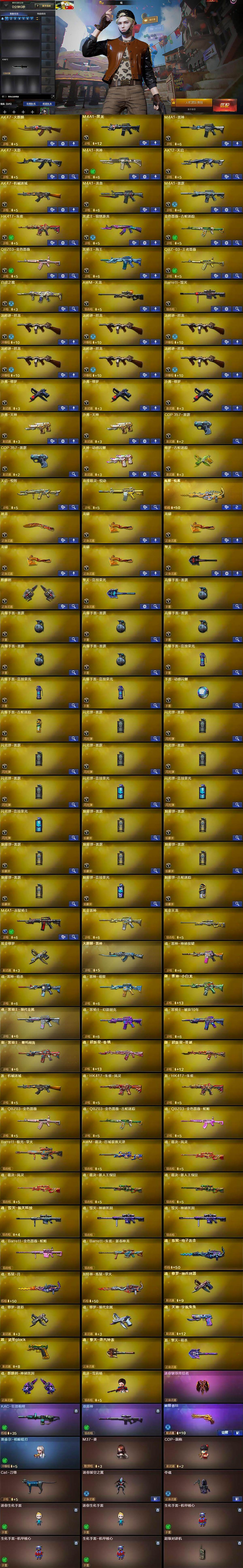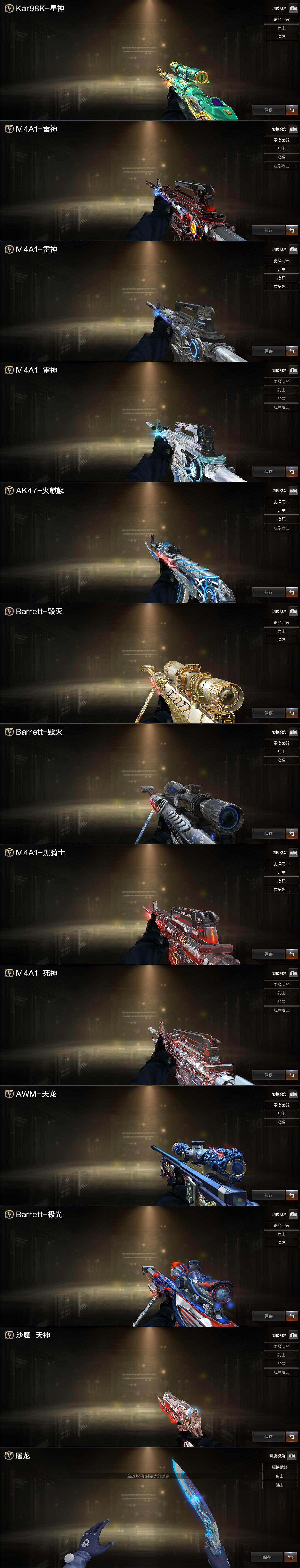 【英雄级武器】:AK47-火麒麟,M4A1-黑龙,M4A1-雷神,AK47-无影,M4A1-死神,AK12-天启,AK47-机械迷城,M4A1-龙血,M4A1-雷霆,HK417-朱雀,黑武士-锦绣游龙,金色蔷薇-古蛇迷踪,QBZ03-金色蔷薇,黑骑士-海王,QBZ-03-王者蔷薇-觉醒版,白虎之魄-觉醒版,AWM-天龙,Barrett-毁灭,汤姆逊-烈龙*6,沙鹰-修罗*3,沙鹰-天神*2,COP-雷霆*2,天神-动感闪耀,修罗-古蛇迷踪,屠龙,龙啸*4,擎天,麒麟刺,擎天-竞技荣光,高爆手雷-雷霆*6,高爆手雷-竞技荣光*3,手雷-动感闪耀,高爆手雷-古蛇迷踪,闪光弹-雷霆*6,闪光弹-竞技荣光*3,烟雾弹-雷霆*6,烟雾弹-竞技荣光,烟雾弹-古蛇迷踪,M4A1-赤狱骑士