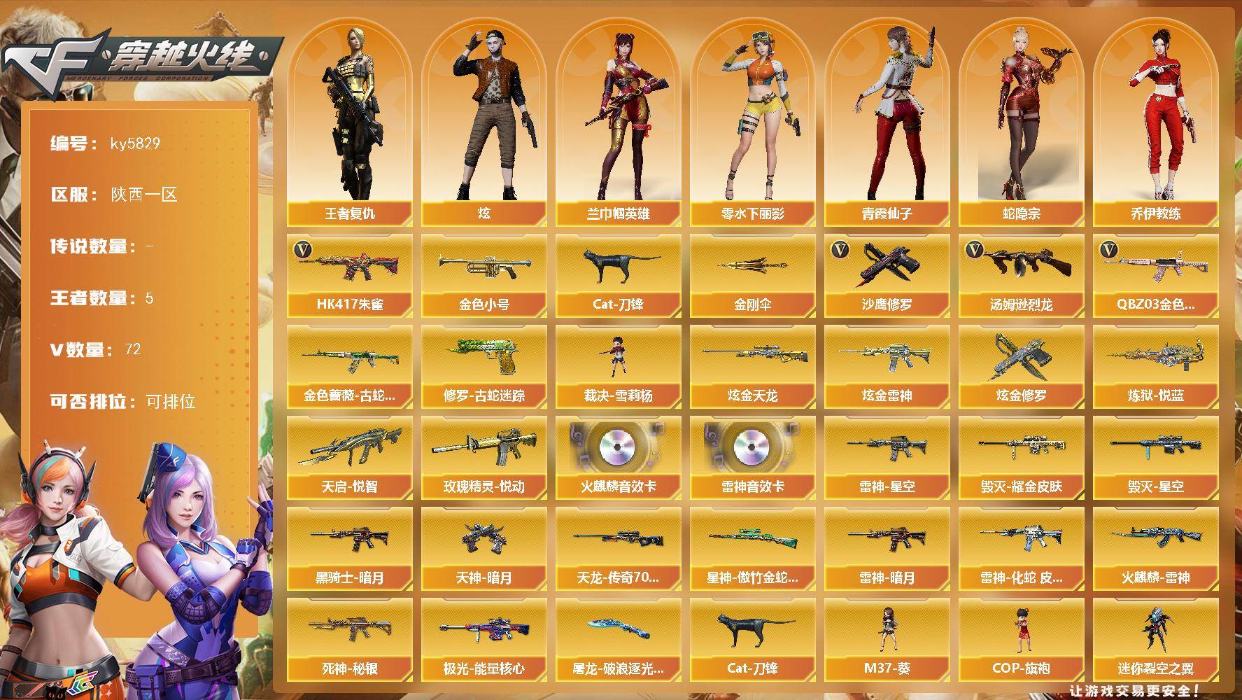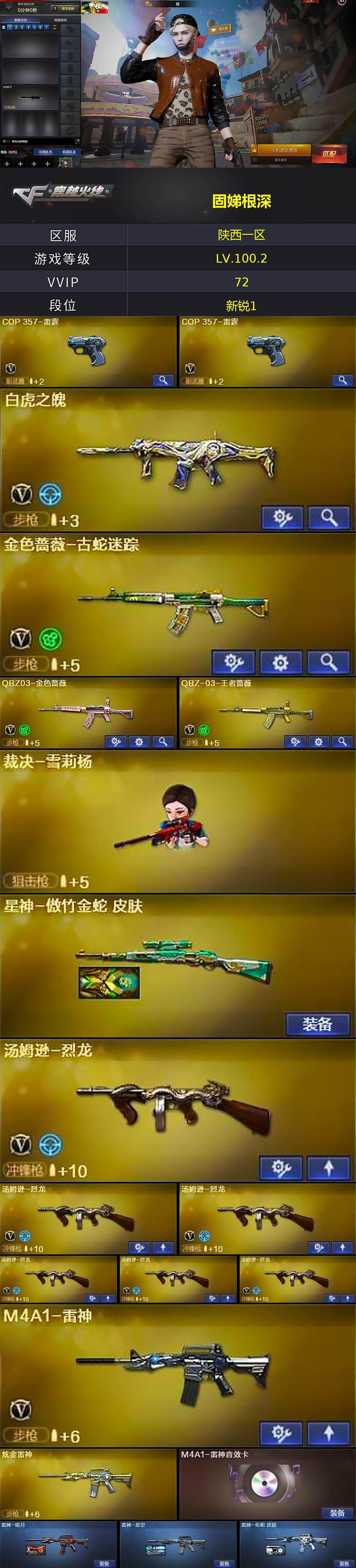[17022912]陕西一区-74V-5王者武器数-3炫金武器数 【热门武器】:QBZ03-金色蔷薇,HK417-朱雀,金色蔷薇-古蛇迷踪,修罗-古蛇迷踪,金色小号,Cat-刀锋,汤姆逊-烈龙*6,裁决-雪莉杨,沙鹰-修罗*3,金刚伞 【王者炫金武器】:天启-悦智,玫瑰精灵-悦动,炼狱-悦蓝,炫金雷神,炫金天龙,炫金修罗 【音效卡】:AK47-火麒麟音效卡,M4A1-雷神音效卡 【皮肤】:星神-傲竹金蛇 皮肤,雷神-暗月,雷神-星空,雷神-化蛇 皮肤,火麒麟-雷神,毁灭耀金皮肤,毁灭-星空,黑骑士-暗月,死神-秘银*2,AWM-天龙-传奇70KG,极光-能量核心,天神-暗月*2,屠龙-破浪逐光 皮肤 【角色】:炫,兰-巾帼英雄,王者复仇,蛇隐宗,乔伊教练,暗夜-X,电竞少女,芳心审判者,疾风,娟娟,兰-海滩派对,0号玩家,零-水下丽影,龙儿,青霞仙子,蛇姬,影武者-X,智影 【人偶武器】:裁决-雪莉杨,迷你钢铁终结者,斯泰尔-枪娘暗刃,M37-葵,COP-旗袍,Cat-刀锋,迷你裂空之翼,夺魂,迷你生化手雷*2,生化手雷-机甲核心*3 【暴走生化】:KAC-狂怒咆哮,双面神,超级对讲机 【挑战大师】:阐释者III 【英雄级武器】:AK47-火麒麟,M4A1-黑龙,M4A1-雷神,AK47-无影,M4A1-死神,AK12-天启,AK47-机械迷城,M4A1-龙血,M4A1-雷霆,HK417-朱雀,黑武士-锦绣游龙,金色蔷薇-古蛇迷踪,QBZ03-金色蔷薇,黑骑士-海王,QBZ-03-王者蔷薇-觉醒版,白虎之魄-觉醒版,AWM-天龙,Barrett-毁灭,汤姆逊-烈龙*6,沙鹰-修罗*3,沙鹰-天神*2,COP-雷霆*2,天神-动感闪耀,修罗-古蛇迷踪,屠龙,龙啸*4,擎天,麒麟刺,擎天-竞技荣光,高爆手雷-雷霆*6,高爆手雷-竞技荣光*3,手雷-动感闪耀,高爆手雷-古蛇迷踪,闪光弹-雷霆*6,闪光弹-竞技荣光*3,烟雾弹-雷霆*6,烟雾弹-竞技荣光,烟雾弹-古蛇迷踪,M4A1-赤狱骑士 【道具】:BS战队炫彩背包,CFS限定背包,亚洲杯纪念炫彩背包,古蛇迷踪炫彩背包,女皇终结者-背包,战舰背包,炫彩背包-诺拉,炫彩背包,超级背包,黄金魔花研究所背包,哔哩哔哩名片,圣拳猎手-炽雪,女皇终结者-魔龙之吻,救世主-黑桃战神,绿色巨人,灵魂忍者*2,变异宝贝,迷雾幽灵*2,生化弹匣,夺命之镰,