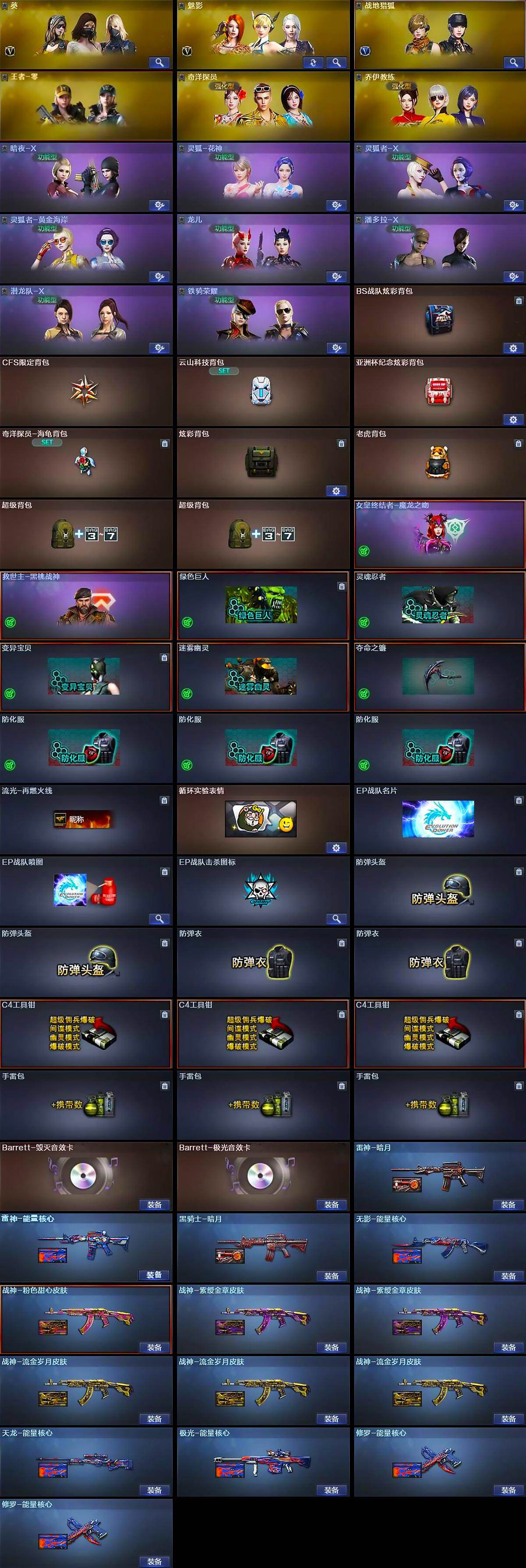 【道具】:BS战队炫彩背包,CFS限定背包,云山科技背包,亚洲杯纪念炫彩背包,奇洋探员-海龟背包,炫彩背包,老虎背包,超级背包*2,女皇终结者-魔龙之吻,救世主-黑桃战神,绿色巨人,灵魂忍者,变异宝贝,迷雾幽灵,夺命之镰,防化服*3,流光-再燃火线,循环实验表情,EP战队名片,EP战队喷图,EP战队击杀图标,防弹头盔*2,防弹衣*2,C4工具钳*3,手雷包*3