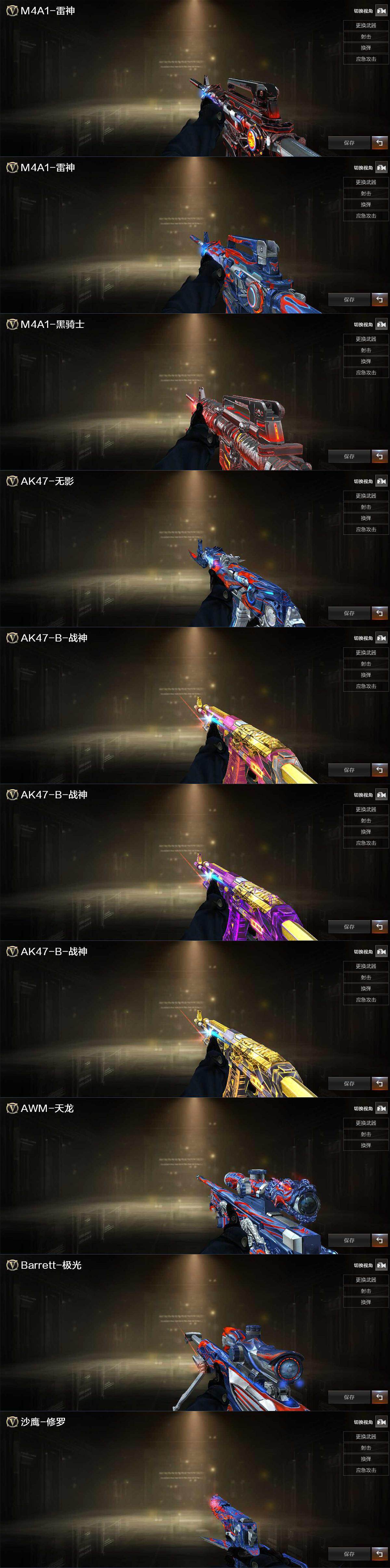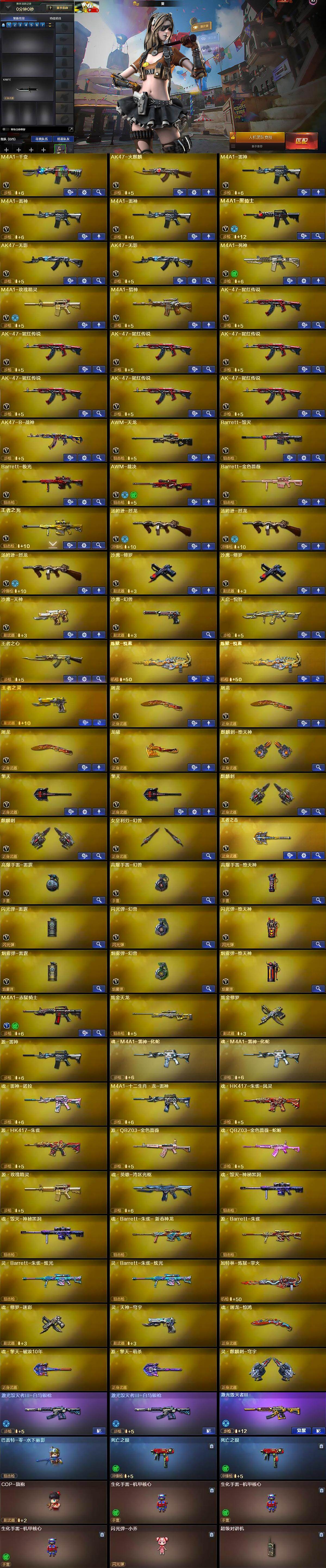 【英雄级武器】:M4A1-千变,AK47-火麒麟,M4A1-雷神*3,M4A1-黑骑士,AK47-无影*2,M4A1-死神,M4A1-玫瑰精灵,M4A1-猎神,AK-47-猩红传说*7,AK47-B-战神,AWM-天龙,Barrett-毁灭,Barrett-极光,AWM-裁决,Barrett-金色蔷薇,王者之光-觉醒版,汤姆逊-烈龙*3,沙鹰-修罗*2,沙鹰-天神,沙鹰-幻兽,屠龙*3,龙啸,麒麟刺-堕天神,擎天*2,麒麟刺*2,女皇利刃-幻兽,王者之击-觉醒版,高爆手雷-雷霆,高爆手雷-幻兽,高爆手雷-堕天神,闪光弹-雷霆,闪光弹-幻兽,闪光弹-堕天神,烟雾弹-雷霆,烟雾弹-幻兽,烟雾弹-堕天神,M4A1-赤狱骑士