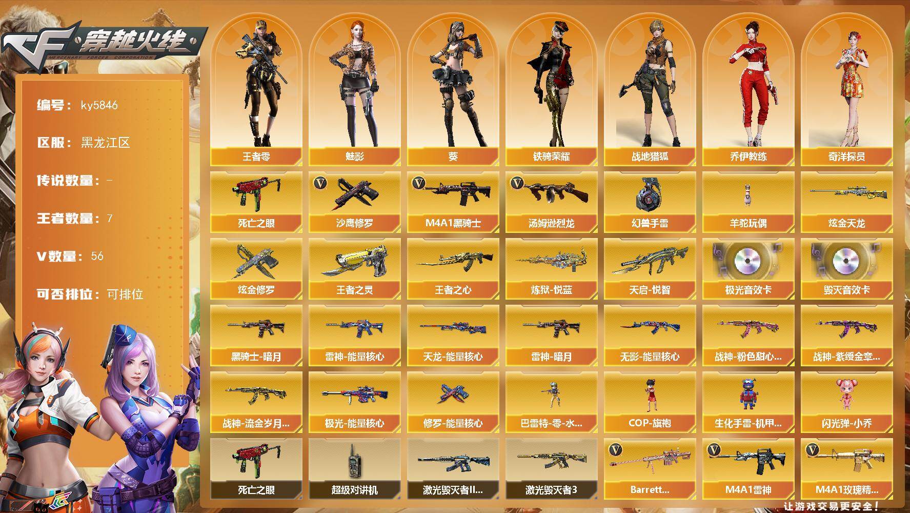 [17023370]黑龙江区-58V-7王者武器数-2炫金武器数 【热门武器】:死亡之眼*2,M4A1-黑骑士,汤姆逊-烈龙*3,羊驼玩偶,沙鹰-修罗*2,高爆手雷-幻兽 【王者炫金武器】:天启-悦智,王者之心,炼狱-悦蓝*2,王者之灵,炫金天龙,炫金修罗 【音效卡】:Barrett-毁灭音效卡,Barrett-极光音效卡 【皮肤】:雷神-暗月,雷神-能量核心,黑骑士-暗月,无影-能量核心,战神-粉色甜心皮肤,战神-紫绶金章皮肤*2,战神-流金岁月皮肤*3,天龙-能量核心,极光-能量核心,修罗-能量核心*2 【角色】:葵,魅影,战地猎狐,王者-零,奇洋探员,乔伊教练,暗夜-X,0号玩家,灵狐-花神,灵狐者-X,灵狐者-黄金海岸,龙儿,潘多拉-X,潜龙队-X,铁骑荣耀 【人偶武器】:巴雷特-零-水下丽影,COP-旗袍,生化手雷-机甲核心*3,闪光弹-小乔 【暴走生化】:死亡之眼*2,超级对讲机 【挑战大师】:激光毁灭者III-白马银枪*2,激光毁灭者III 【英雄级武器】:M4A1-千变,AK47-火麒麟,M4A1-雷神*3,M4A1-黑骑士,AK47-无影*2,M4A1-死神,M4A1-玫瑰精灵,M4A1-猎神,AK-47-猩红传说*7,AK47-B-战神,AWM-天龙,Barrett-毁灭,Barrett-极光,AWM-裁决,Barrett-金色蔷薇,王者之光-觉醒版,汤姆逊-烈龙*3,沙鹰-修罗*2,沙鹰-天神,沙鹰-幻兽,屠龙*3,龙啸,麒麟刺-堕天神,擎天*2,麒麟刺*2,女皇利刃-幻兽,王者之击-觉醒版,高爆手雷-雷霆,高爆手雷-幻兽,高爆手雷-堕天神,闪光弹-雷霆,闪光弹-幻兽,闪光弹-堕天神,烟雾弹-雷霆,烟雾弹-幻兽,烟雾弹-堕天神,M4A1-赤狱骑士 【道具】:BS战队炫彩背包,CFS限定背包,云山科技背包,亚洲杯纪念炫彩背包,奇洋探员-海龟背包,炫彩背包,老虎背包,超级背包*2,女皇终结者-魔龙之吻,救世主-黑桃战神,绿色巨人,灵魂忍者,变异宝贝,迷雾幽灵,夺命之镰,防化服*3,流光-再燃火线,循环实验表情,EP战队名片,EP战队喷图,EP战队击杀图标,防弹头盔*2,防弹衣*2,C4工具钳*3,手雷包*3 【特殊枪械】:1黑骑士,3烈龙
