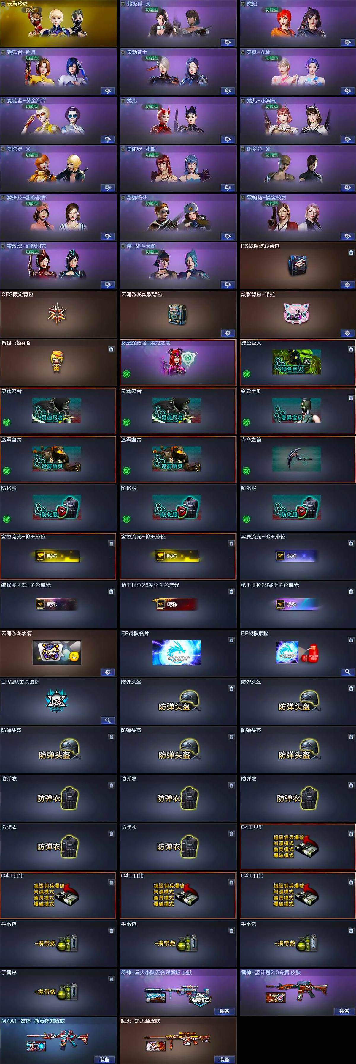 【道具】:BS战队炫彩背包,CFS限定背包,云海游龙炫彩背包,炫彩背包-诺拉,背包-洛丽塔,女皇终结者-魔龙之吻,绿色巨人,灵魂忍者*2,变异宝贝,迷雾幽灵*2,夺命之镰,防化服*3,金色流光-枪王排位*2,星辰流光-枪王排位,巅峰赛先锋-金色流光,枪王排位28赛季金色流光,枪王排位29赛季金色流光,云海游龙表情,EP战队名片,EP战队喷图,EP战队击杀图标,防弹头盔*5,防弹衣*5,C4工具钳*4,手雷包*4