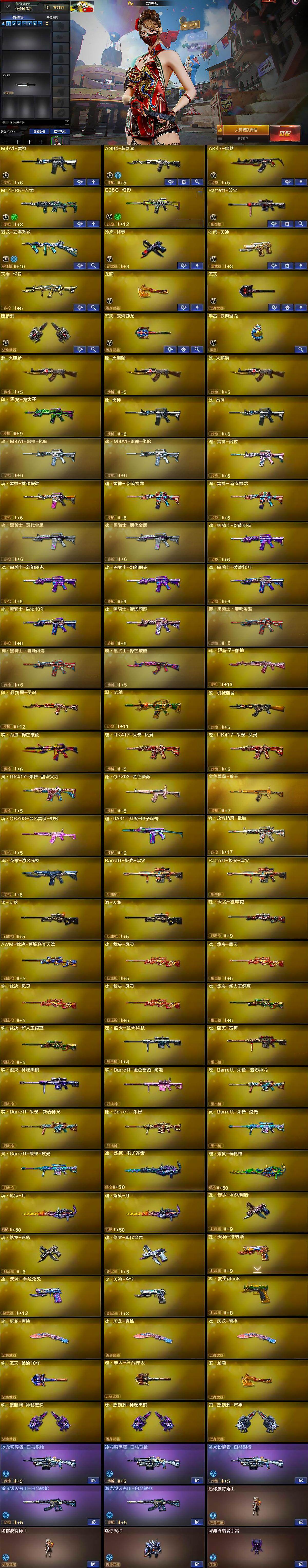 【英雄级武器】:M4A1-雷神,AN94-超新星,AK47-黑鲨,M14EBR-玄武,G36C-幻影,Barrett-毁灭,烈龙-云海游龙,沙鹰-修罗,沙鹰-天神,龙啸,擎天,麒麟刺,擎天-云海游龙,手雷-云海游龙
