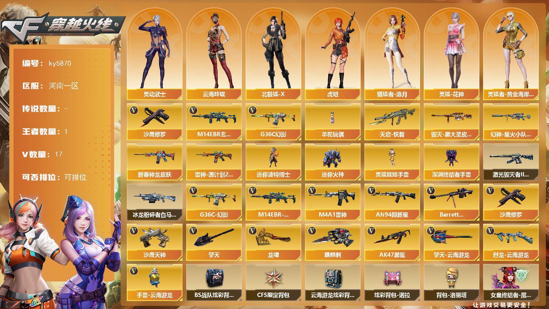 [17023558]河南一区-20V-1王者武器数-0炫金武器数 【热门武器】:G36C-幻影,M14EBR-玄武,羊驼玩偶,沙鹰-修罗 【王者炫金武器】:天启-悦智 【皮肤】:幻神-星火小队签名臻藏版 皮肤,M4A1-雷神-新春神龙皮肤,雷神-源计划2.0专属 皮肤,毁灭-黑大圣皮肤 【角色】:云海玲珑,北极狐-X,虎妞,猎狐者-追月,灵动武士,灵狐-花神,灵狐者-黄金海岸,龙儿,龙儿-小淘气,曼陀罗-X,曼陀罗-礼服,潘多拉-X,潘多拉-甜心教官,兔囡囡,新娜塔莎,雪莉杨-摸金校尉,夜玫瑰-幻能朋克,樱-战斗天使 【人偶武器】:迷你波特博士*2,迷你火种,深渊终结者手雷,灵狐娃娃手雷*2 【挑战大师】:冰龙粉碎者-白马银枪*3,激光毁灭者III-白马银枪*2 【英雄级武器】:M4A1-雷神,AN94-超新星,AK47-黑鲨,M14EBR-玄武,G36C-幻影,Barrett-毁灭,烈龙-云海游龙,沙鹰-修罗,沙鹰-天神,龙啸,擎天,麒麟刺,擎天-云海游龙,手雷-云海游龙 【道具】:BS战队炫彩背包,CFS限定背包,云海游龙炫彩背包,炫彩背包-诺拉,背包-洛丽塔,女皇终结者-魔龙之吻,绿色巨人,灵魂忍者*2,变异宝贝,迷雾幽灵*2,夺命之镰,防化服*3,金色流光-枪王排位*2,星辰流光-枪王排位,巅峰赛先锋-金色流光,枪王排位28赛季金色流光,枪王排位29赛季金色流光,云海游龙表情,EP战队名片,EP战队喷图,EP战队击杀图标,防弹头盔*5,防弹衣*5,C4工具钳*4,手雷包*4 【特殊枪械】: