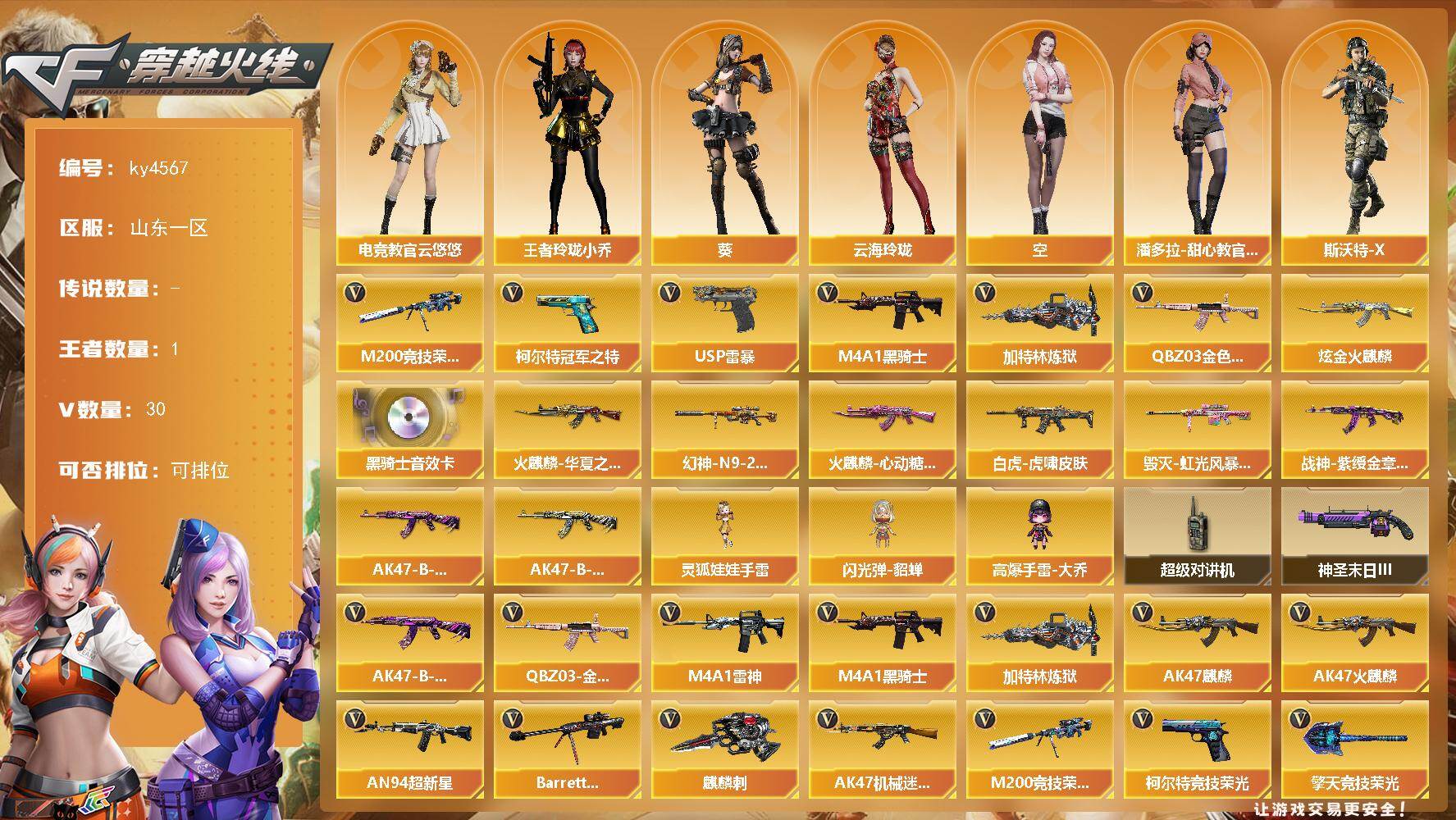 [17024354]山东一区-30V-1王者-1炫金 【热门武器】:QBZ03-金色蔷薇,M200-竞技荣光,柯尔特-冠军之特,M4A1-黑骑士,加特林-炼狱,USP-雷暴 【王者炫金武器】:炫金火麒麟 【音效卡】:M4A1-黑骑士音效卡 【皮肤】:M200-幻神-N9-2022MVP,白虎-虎啸皮肤,火麒麟-华夏之心,火麒麟-心动糖果,毁灭-虹光风暴 皮肤,战神-紫绶金章皮肤,AK47-B-常胜将军-曹操*2,AK47-B-常胜将军-刘备 【角色】:葵,电竞教官-云悠悠,王者玲珑-小乔,云海玲珑,空,潘多拉-甜心教官,斯沃特-X 【人偶武器】:闪光弹-貂蝉,高爆手雷-大乔,灵狐娃娃手雷 【暴走生化】:超级对讲机 【挑战大师】:神圣爆裂者-末日III 【英雄级武器】:AK47-火麒麟,AK47-麒麟,M4A1-雷神,M4A1-黑骑士,AN94-超新星,AK47-机械迷城,QBZ03-金色蔷薇,AK-47-猩红传说,黑骑士-海王,AK47-B-常胜将军,Barrett-毁灭,M200-竞技荣光,加特林-炼狱,USP-雷暴,柯尔特-冠军之特,柯尔特-竞技荣光,麒麟刺,擎天-竞技荣光,王者之击-觉醒版,高爆手雷-竞技荣光,闪光弹-竞技荣光*2,烟雾弹-竞技荣光*2 【道具】:次元之矛-黄金背包,虎牙炫彩背包,超级背包,救世主-黑桃战神,绿色巨人,灵魂忍者,迷雾幽灵,夺命之镰,防化服*2,金色流光-枪王排位*2,星辰流光-枪王排位,防弹头盔*3,防弹衣*3,C4工具钳*4,手雷包*4 【特殊枪械】:1黑骑士,1炼狱