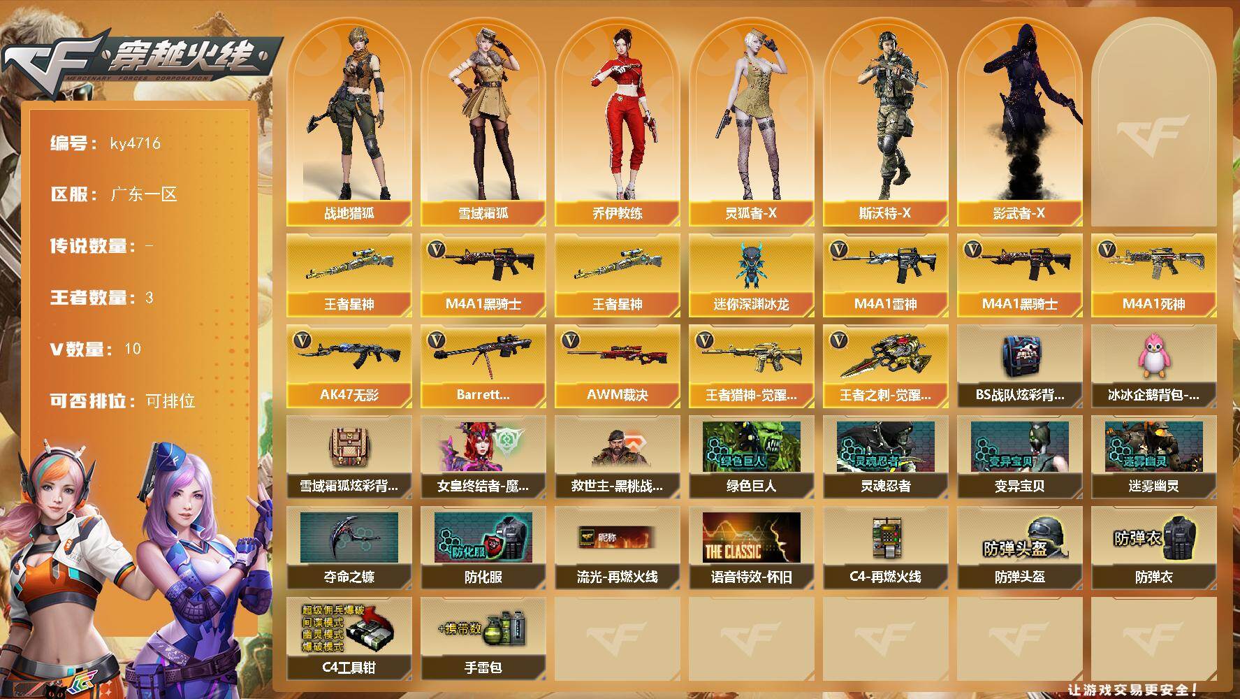 [17027115]广东一区-10V-3王者-0炫金 【热门武器】:王者星神,M4A1-黑骑士 【王者炫金武器】:王者星神 【角色】:战地猎狐,雪域霜狐,乔伊教练,灵狐者-X,斯沃特-X,影武者-X 【人偶武器】:迷你深渊冰龙 【英雄级武器】:M4A1-雷神,M4A1-黑骑士,AK47-无影,M4A1-死神,王者猎神-觉醒版,Barrett-毁灭*3,AWM-裁决,王者之刺-觉醒版 【道具】:BS战队炫彩背包,冰冰企鹅背包-猛男专用,雪域霜狐炫彩背包,女皇终结者-魔龙之吻,救世主-黑桃战神,绿色巨人,灵魂忍者*2,变异宝贝,迷雾幽灵*2,夺命之镰,防化服*3,流光-再燃火线,语音特效-怀旧,C4-再燃火线,防弹头盔*3,防弹衣*3,C4工具钳*3,手雷包*3 【特殊枪械】:1黑骑士