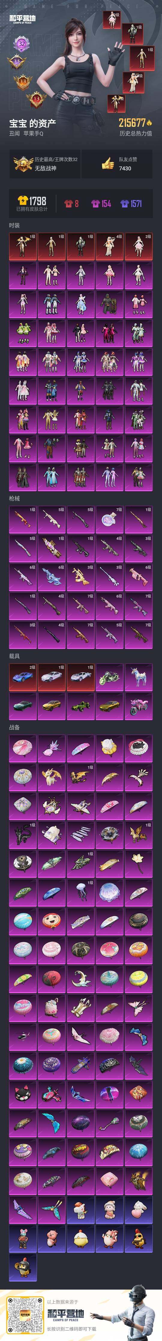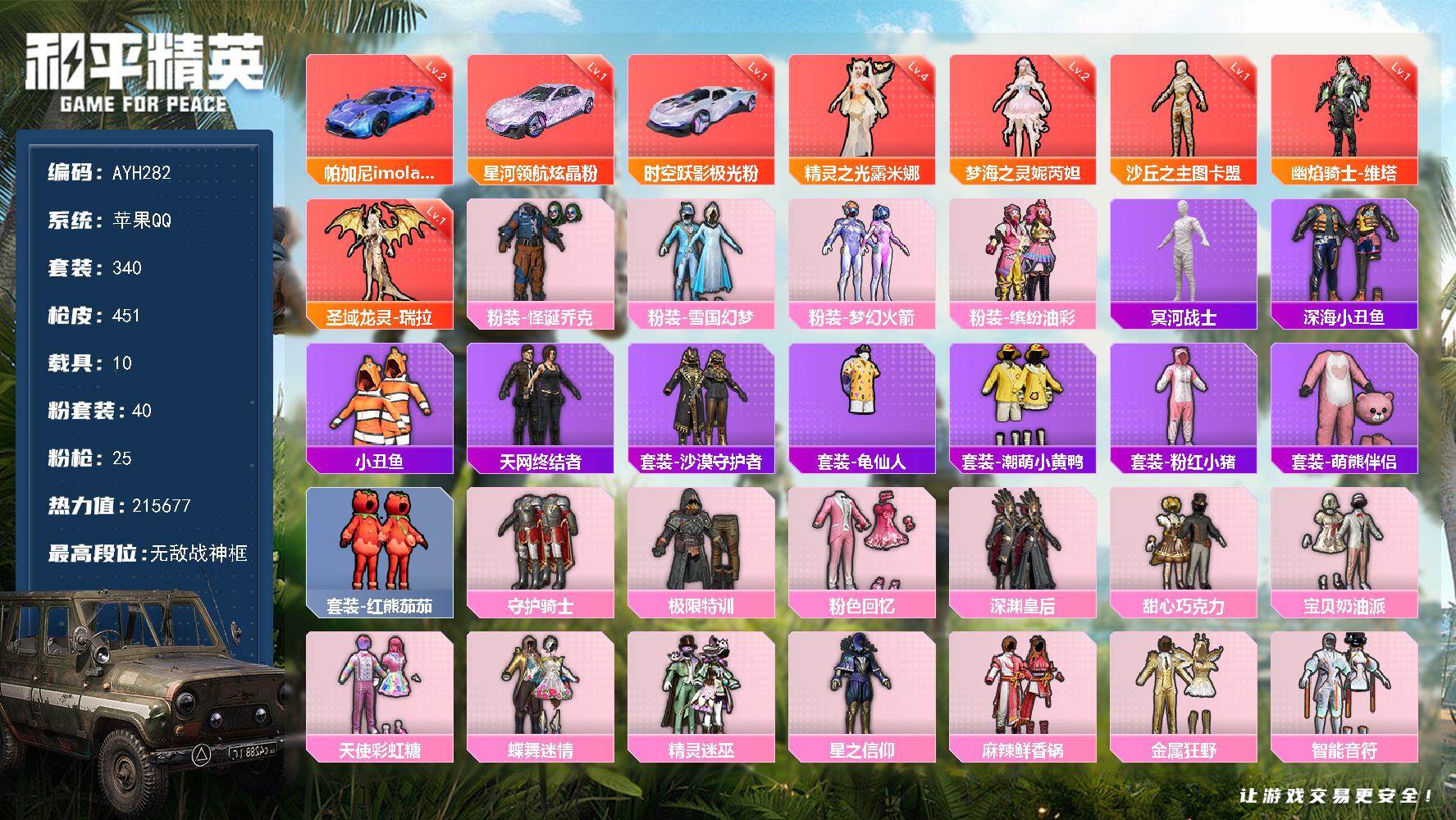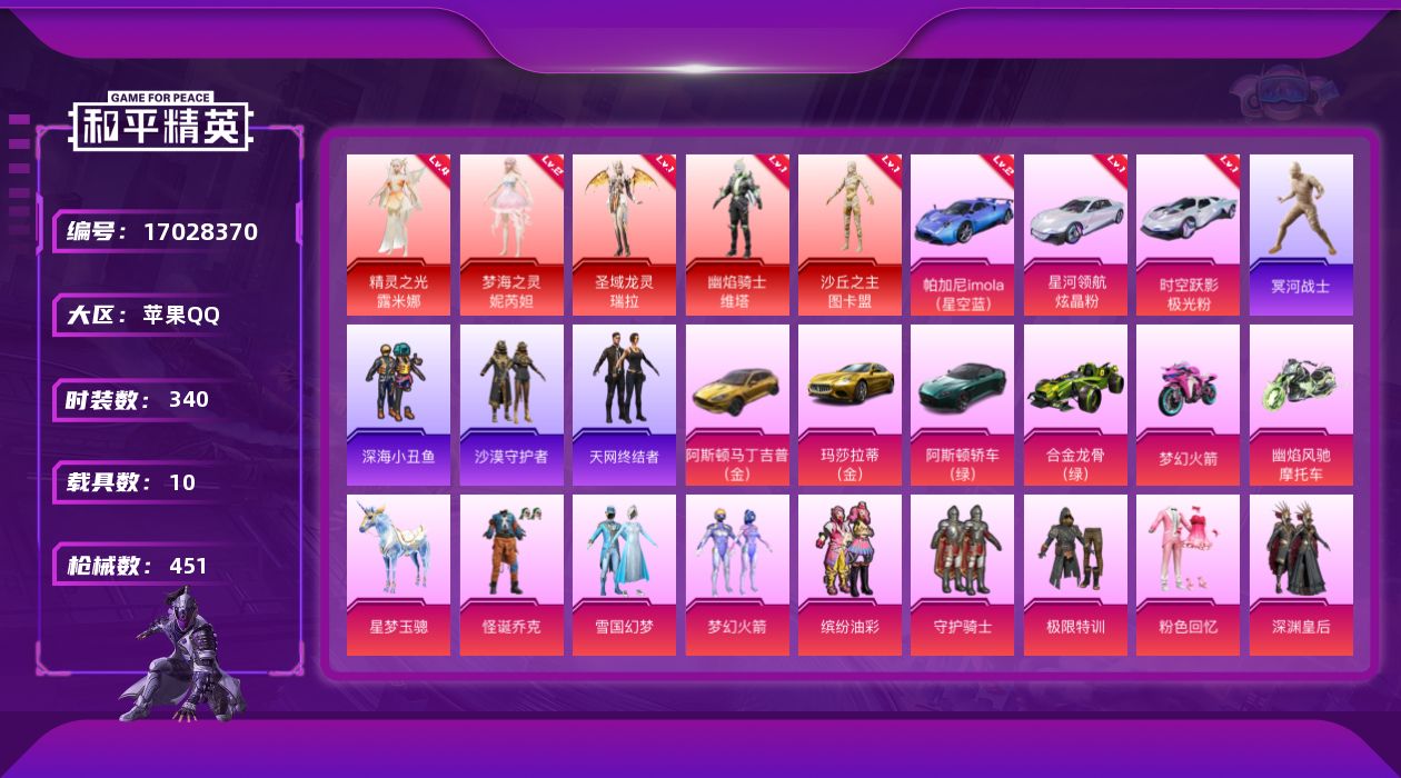 [17028370]苹果 手Q-无敌战神框-5神装-40粉装-25特效枪-10载具-27粉色飞行器-215677热力值-32王牌印记-340套装-451枪皮【红色载具】:时空跃影(极光粉)(一级),星河领航(炫晶粉)(一级),帕加尼imola(星空蓝)(二级)【红色神装等级】:圣域龙灵-瑞拉(一级),幽焰骑士-维塔(一级),精灵之光-露米娜(四级),梦海之灵-妮芮妲(二级),沙丘之主-图卡盟(一级)【红色角色神装】:圣域龙灵-瑞拉,幽焰骑士-维塔,精灵之光-露米娜,梦海之灵-妮芮妲,沙丘之主-图卡盟【热门品类】:粉装-怪诞乔克,粉装-雪国幻梦,粉装-梦幻火箭,粉装-缤纷油彩,套装-冥河战士,套装-深海小丑鱼,套装-小丑鱼,套装-天网终结者,套装-沙漠守护者,套装-龟仙人,套装-潮萌小黄鸭,套装-粉红小猪,套装-萌熊伴侣,套装-红熊茄茄【粉色套装】:粉装-守护骑士,粉装-极限特训,粉装-粉色回忆,粉装-怪诞乔克,粉装-深渊皇后,粉装-甜心巧克力,粉装-宝贝奶油派,粉装-天使彩虹糖,粉装-雪国幻梦,粉装-蝶舞迷情,粉装-精灵迷巫,粉装-梦幻火箭,粉装-星之信仰,粉装-麻辣鲜香锅,粉装-金属狂野,粉装-智能音符,粉装-缤纷油彩,粉装-古堡领主,粉装-天禅智恒,粉装-向日葵,粉装-甜蜜誓约,粉装-心之恋语,粉装-极致幻想,粉装-星空之魅,粉装-幻彩马卡龙,粉装-花间之火,粉装-绮梦青鸾,粉装-馨动时刻,粉装-蜜桃特工,粉装-蝶舞蔷薇,粉装-恐龙拽拽,粉装-第五大道,粉装-飒粉甜心,角色-星梦奇缘,粉装-未来领航者,角色-千金淑猫,角色-月下星之子,角色-樱桃泡泡,角色-罪夜之冕【粉色枪皮等级】:AKM-甜心宝贝(七级),AKM-炫紫旋律(七级),AKM-幽焰骑士(三级),SCAR-L-梦幻火箭(五级),SCAR-L-时空协奏(六级),M416-五爪金龙(七级),M416-心之恋语(七级),M416-墨龙九天(一级),GROZA-精灵之光(三级),AUG-星梦奇缘(六级),M762-甜蜜誓约(六级),Vector-飒粉甜心(六级),AKS-74U-信仰神谕(四级),P90-沙丘之主(一级),Kar98K-伏魔团(一级),Kar98K-巳巳如意(五级),Kar98K-圣域龙灵(一级),M24-星之信仰(四级),Mini14-龙虾霸霸(三级),M200-梦海之灵(三级),DP-28-扶摇飞仙(四级