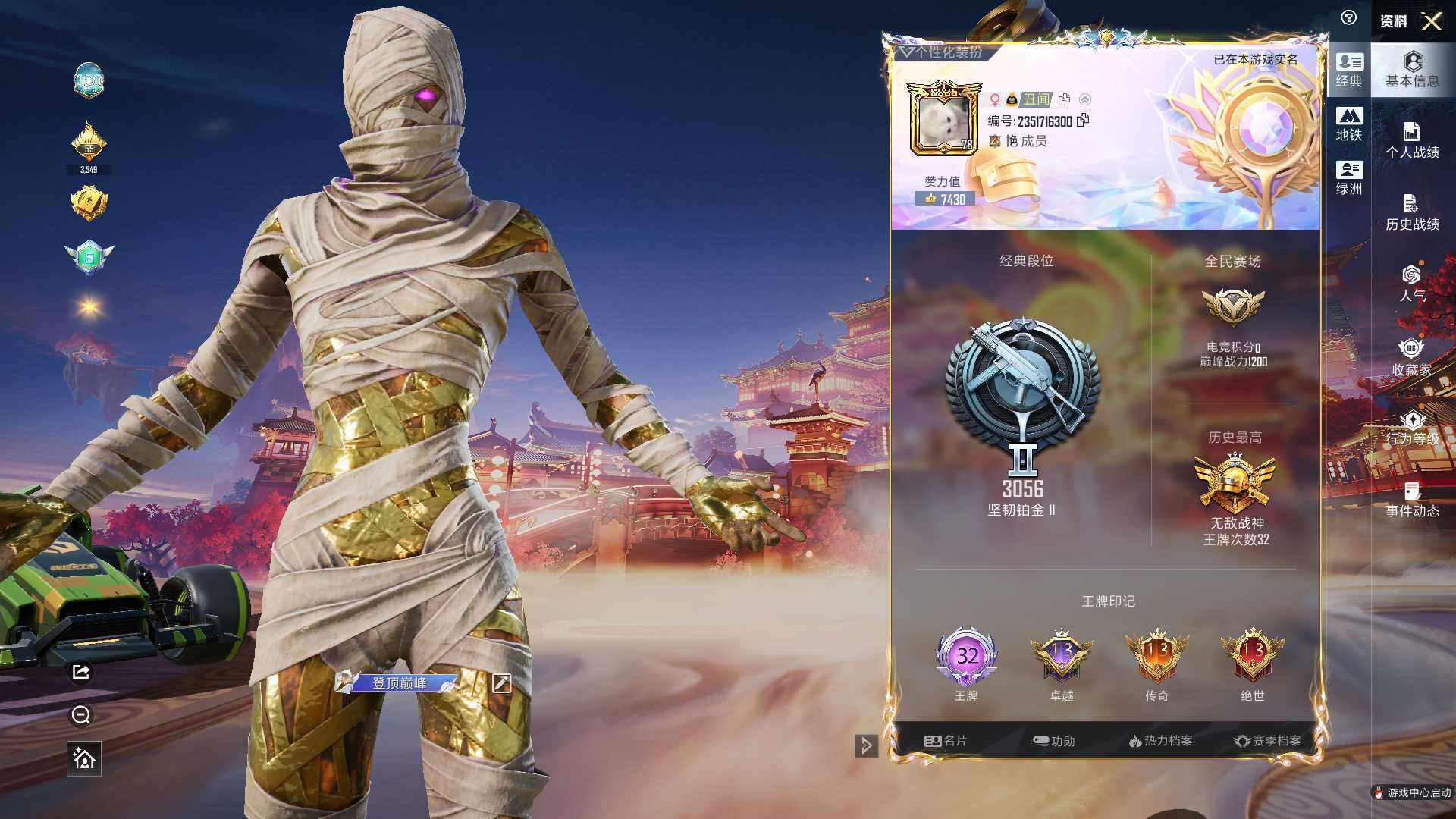 - [15611819]素材身法号/老木乃伊/无敌战神框1/绝世印记3/地铁满天赋 苹果 微信-无敌战神框-33粉装-31特效枪-9载具-5粉色飞行器-15.6w热力值-21王牌印记-283套装-411枪皮【热门品类】:粉装-怪诞乔克,粉装-雪国幻梦,粉装-梦幻火箭,粉装-童趣迷兔,粉装-缤纷油彩,套装-浪漫天命,套装-赤蝎幽灵,套装-都市猎人,套装-冥河战士,套装-派对舞王,套装-深海小丑鱼,套装-小丑鱼,套装-奇异狩猎者,套装-胖达圆圆,套装-动感兔斯基人偶服,套装-AG战队服,角色-忠真马岱,套装-潮萌小黄鸭,套装-暗影哥特,套装-浪漫波比,套装-萌熊伴侣,角色-六号稻草人,小丑红鼻头,M416-星际漫游,大砍刀-青龙偃月刀,撬棍-龙胆亮银枪,套装-红熊茄茄【粉色载具】:阿斯顿马丁DBS(红),双人摩托-梦幻火箭,盛世惊鸿摩托车,鬼马风驰,空客H135-蔚蓝之翼,僚机-圣域龙宝,赤兔,照夜玉狮子,护世瑞兽【粉色套装】:粉装-极限特训,粉装-粉色回忆,粉装-怪诞乔克,粉装-甜心巧克力,粉装-宝贝奶油派,粉装-天使彩虹糖,粉装-雪国幻梦,粉装-蝶舞迷情,粉装-梦幻火箭,粉装-金属狂野,粉装-缤纷油彩,粉装-放客神游,粉装-花间之火,粉装-俏皮狐尾,粉装-冰霜白皇,粉装-童趣迷兔,粉装-炙焰红王,粉装-香水柠檬,粉装-馨动时刻,粉装-暗夜玫瑰,角色-闪耀迪迦,粉装-彩虹鹿灵,角色-洛天依,粉装-岚岚物语,粉装-橘柚倾心,粉装-灵感创作师,粉装-炫光之旅,粉装-暖暖奶龙,角色-月影灵韵,角色-樱桃泡泡,角色-冷漠罗丽,角色-荧海星豚,角色-绯穹魔姬【粉色枪皮等级】:AKM-炫紫旋律(一级),AKM-百合蜜语(七级),AKM-魔法神域(三级),SCAR-L-童趣迷兔(一级),SCAR-L-金蛇镇世(六级),M416-心之恋语(一级),M416-暖熊萌萌(七级),GROZA-焦糖拿铁(四级),AUG-超新星(五级),M762-甜蜜誓约(六级),蜜獾-荧海星豚(一级),蜜獾-异瞳寒姬(五级),UZI-绮梦青鸾(五级),UMP45-相思残雪(四级),Vector-灵感创作师(六级),Vector-绯穹魔姬(一级),汤姆逊-热量炸弹(五级),P90-能量风暴(五级),P90-冷漠罗丽(一级),Kar98K-绿意幻情(三级),Kar98K-巳巳如意(五级),Kar98K-圣域龙灵(三级),AWM-橘柚