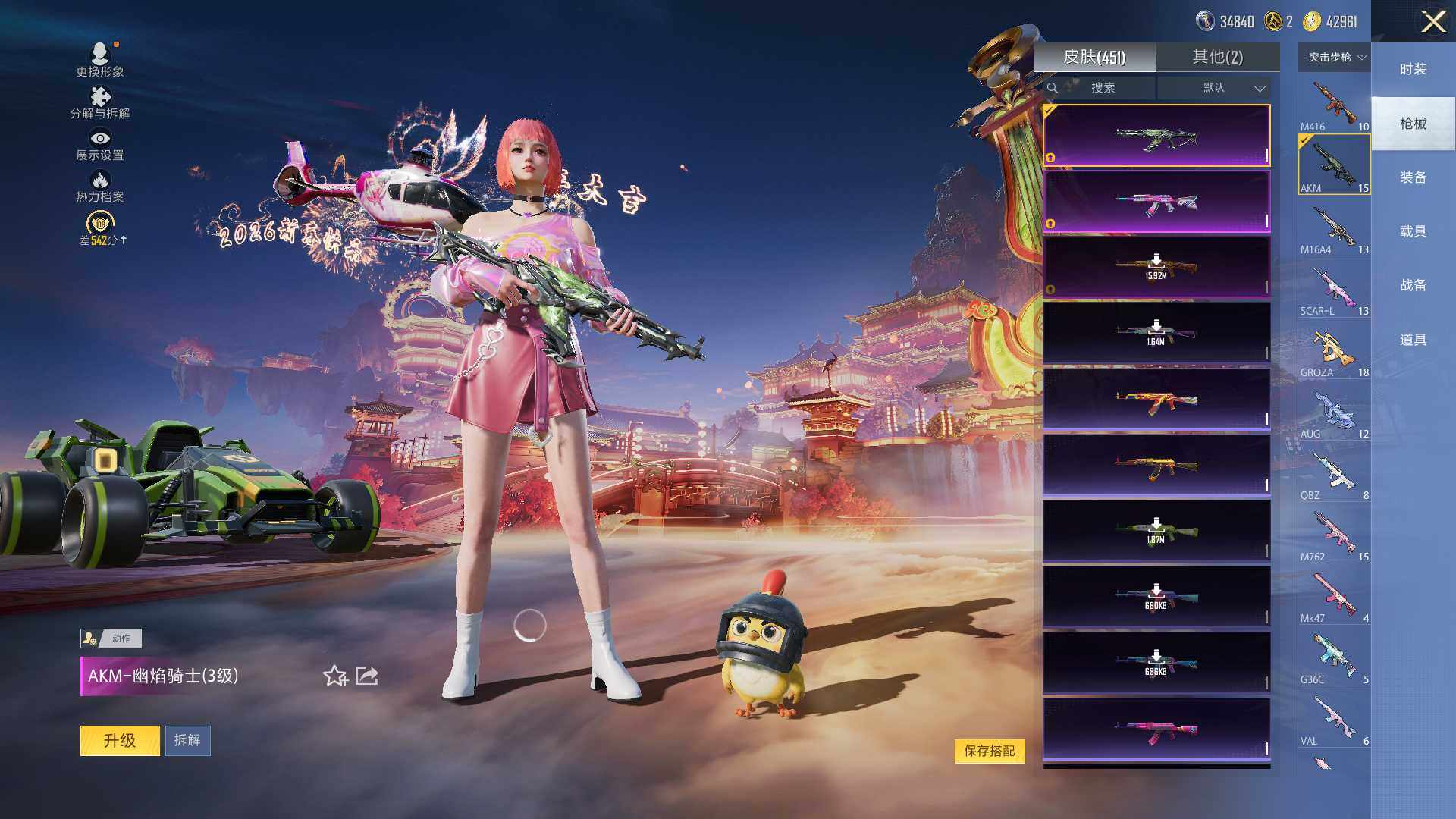 AKM-甜心宝贝,AKM-炫紫旋律,AKM-幽焰骑士,SCAR-L-梦幻火箭,SCAR-L-时空协奏,M416-五爪金龙,M416-心之恋语,M416-墨龙九天,GROZA-精灵之光,AUG-星梦奇缘,M762-甜蜜誓约,Vector-飒粉甜心,AKS-74U-信仰神谕,P90-沙丘之主,Kar98K-伏魔团,Kar98K-巳巳如意,Kar98K-圣域龙灵,M24-星之信仰,Mini14-龙虾霸霸,M200-梦海之灵,DP-28-扶摇飞仙