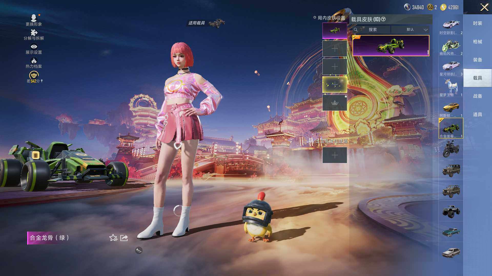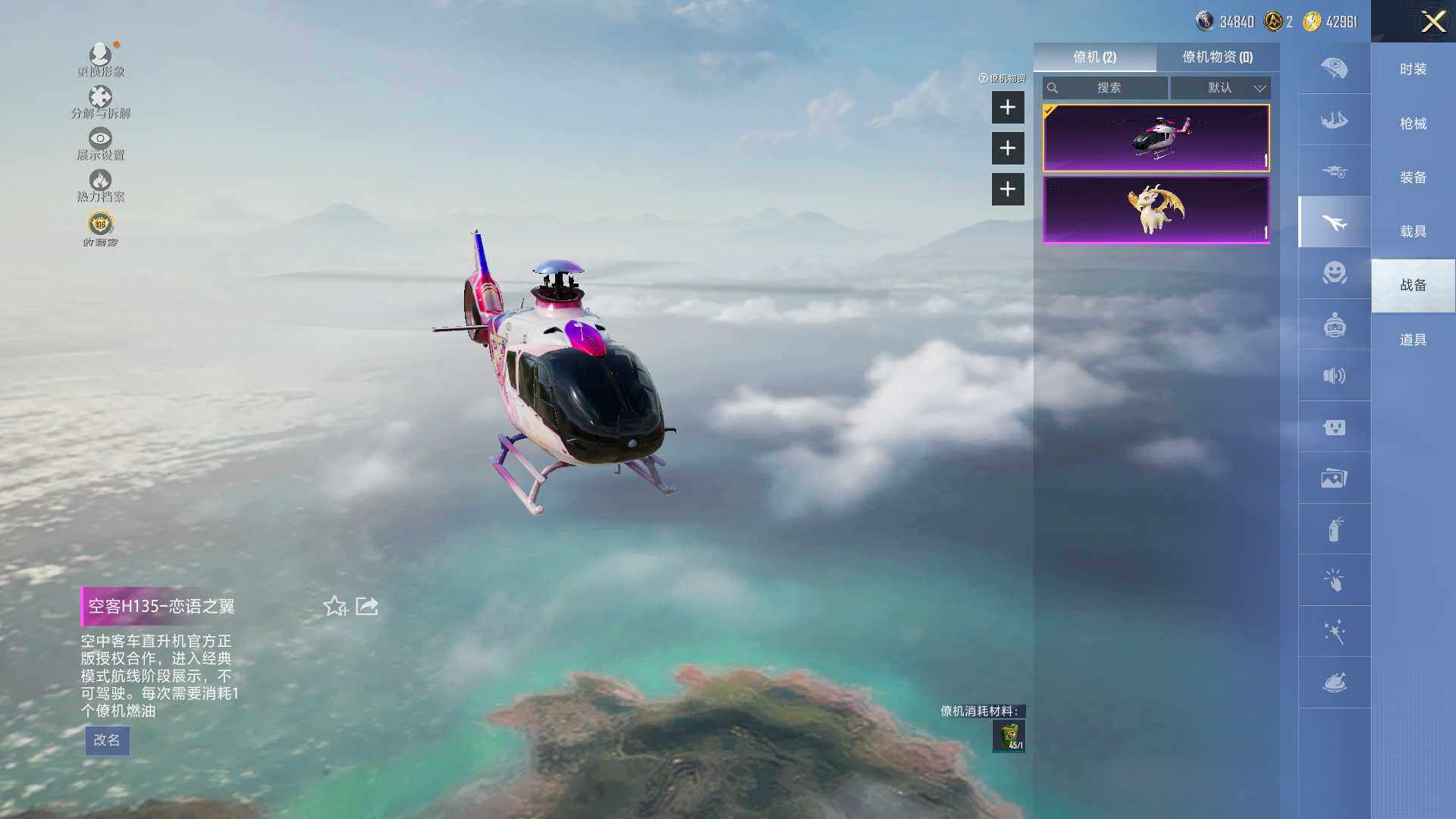 阿斯顿·马丁DBS(绿),阿斯顿·马丁DBX(金),玛莎拉蒂Ghibli(金),帕加尼imola(星空蓝),星河领航(炫晶粉),时空跃影(极光粉),合金龙骨(绿),双人摩托-梦幻火箭,幽焰风驰摩托车,空客H135-恋语之翼,僚机-圣域龙宝,星梦玉骢
