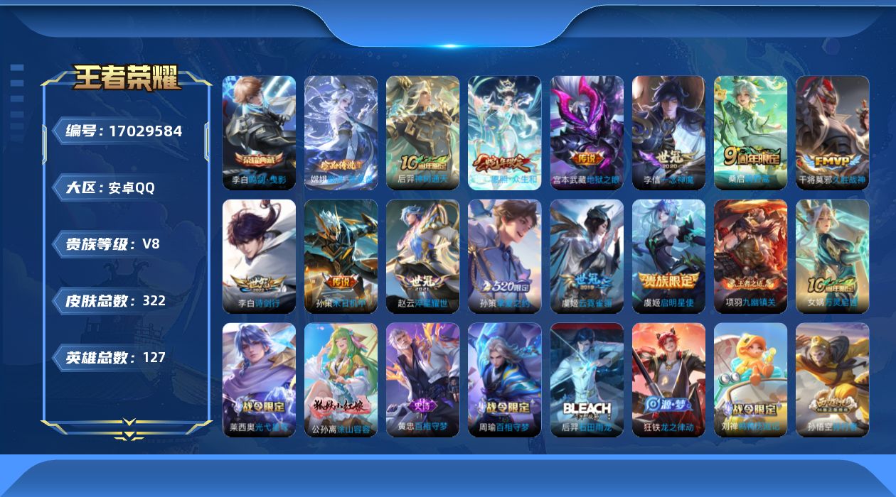 [17029584]可二次,【店主推荐捡漏号!可直接换绑】安卓Q-V8-最强王者段位-127英雄-320皮肤-1典藏-1珍品传说-12传说-105史诗 【英雄全皮】:狂铁全皮,影全皮 【荣耀典藏】:李白鸣剑曳影 【珍品传说】:嫦娥器灵落星盏 【传说皮肤】:后羿神树通天,妲己愿照众生和,桑启鸣野蒿,李白诗剑行,孙策挚爱之约,孙策末日机甲,赵云淬星耀世,虞姬启明星使,李信一念神魔,干将莫邪久胜战神,虞姬云霓雀翎,宫本武藏地狱之眼 【限定皮肤】:白起狰,蔡文姬夏日便利店,虞姬夏日便利店,姜子牙天穹之誓,狄仁杰阴阳师,赵云皇家上将,赵云龙胆,嬴政优雅恋人,孙尚香蔷薇恋人,钟无艳超时空战士,白起夜都怪侠,芈月重明,吕布猎兽之王,周瑜赤莲之焰,元歌无心,夏侯惇朔风刀,甄姬落雪兰心,曹操烛龙,典韦穷奇,马可波罗逐梦之星,马可波罗暗影游猎,马可波罗山海玄木吟,狄仁杰魔术师,狄仁杰万华元夜,达摩沙漠行僧,项羽海滩派对,项羽霸王别姬,老夫子醍醐杖,程咬金演武夺筹,韩信飞衡,王昭君午后时光,兰陵王金庭之子,孙悟空孙行者,牛魔御旌,李元芳匿光侦查者,李元芳云中旅人,虞姬启明星使,钟馗驱傩正仪,杨玉环遇见飞天,雅典娜黎明之约,鬼谷子原初探秘者,鬼谷子五谷丰年,铠青龙志,苏烈千军破阵,百里玄策原初追逐者,弈星混沌棋,梦奇顽趣,沈梦溪大漠名商,明世隐疑决卦,明世隐吟游魔法,裴擒虎李小龙,裴擒虎擒涛扼浪,狂铁御狮,狂铁电玩高手,米莱狄御霄,盾山御銮,孙策挚爱之约,上官婉儿梁祝,嫦娥拒霜思,嫦娥暖冬兔眠,西施玲珑珍味,鲁班大师探海日志,桑启海盐诗旅,暃星界游侠,戈娅驭风魔法,艾琳流音漫舞,司空震地狱燃心,阿古朵江河有灵,张良古海寻踪,蒙犽百解令,蒙恬荣光圣徽,高渐离燃音魔法,妲己灵卜魔法,鬼谷子天穹祈灯,沈梦溪龙舞盛年,鲁班七号蔬乡物语,李元芳蔬乡物语,刘邦剑破天穹,程咬金群星魔术团,镜青焰无极,项羽苍威无极,芈月浮光幕影,周瑜熔金海岸 【年限皮肤】:铠青龙志,韩信飞衡,赵云龙胆,马可波罗山海玄木吟 【赛季限定】:白起狰,芈月重明,夏侯惇朔风刀,曹操烛龙,典韦穷奇,狄仁杰万华元夜,达摩沙漠行僧,老夫子醍醐杖,程咬金演武夺筹,兰陵王金庭之子,张良古海寻踪,牛魔御旌,李元芳云中旅人,钟馗驱傩正仪,雅典娜黎明之约,鬼谷子原初探秘者,苏烈千军破阵,百里玄策原初追逐者,弈星混沌棋,梦奇顽趣,沈梦溪大漠名商,明世隐疑决卦,裴擒虎