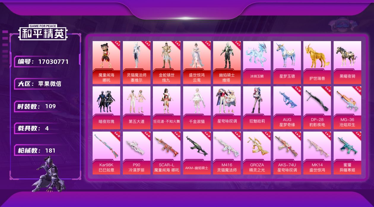 - [13462648]辽宁一区-53V-2王者-2炫金 【热门武器】:QBZ03-金色蔷薇,M4A1-青龙,M200-竞技荣光,凤吟之魄,白虎-电玩蓝兔,M4A1-黑骑士,金色蔷薇-空,沙鹰-修罗 【王者炫金武器】:凤吟之魄,炫金雷神,炫金毁灭 【皮肤】:火麒麟-雷神,火麒麟-平天大圣,毁灭-黑大圣皮肤,毁灭-风暴,黑骑士-战神马超,无影-能量核心,战神-紫绶金章皮肤,AK47-B-常胜将军-刘备,修罗-能量核心 【角色】:兰-巾帼英雄,王者玲珑,乔伊教练,修道士,暗夜-X,初恋灵狐,电竞少女,芳心审判者,风暴女,嘉年华灵狐,娟娟,灵狐者-X,麻雀,曼陀罗-X,曼陀罗-礼服,潜龙队-X,青霞仙子,斯沃特-X,铁骑荣耀,兔囡囡,雪莉杨-摸金校尉,游珑儿 【人偶武器】:金色蔷薇-空,巴雷特-零-水下丽影,AWM-灵狐-15周年嘉年华*2,迷你裂空之翼*8,迷你波特博士*4,夺魂*2,迷你牛牛*2,深渊终结者手雷*2,迷你超能女侍 【挑战大师】:神圣爆裂者III*2,冰龙粉碎者-白马银枪,激光毁灭者III-白马银枪,VEPR-12-金魔*2,激光毁灭者III,机甲撕裂者III,试炼破坏者III,神圣爆裂者-末日III,阐释者III*4,VEPR-12-紫魔*2 【英雄级武器】:AK47-火麒麟,M4A1-雷神,M4A1-黑骑士,AK47-黑鲨,M4A1-青龙,M4A1-神工天巧,无影-神兵利器,黑武士-锦绣游龙,QBZ03-金色蔷薇,烈火-动感闪耀,AK-47-猩红传说*2,白虎-电玩蓝兔,Barrett-毁灭,M200-竞技荣光,沙鹰-修罗,COP 357-云龙,USP-神工天巧*2,天神-动感闪耀,屠龙,麒麟刺,擎天-竞技荣光,唐刀-神工天巧,屠龙-动感闪耀,高爆手雷-竞技荣光*3,高爆手雷-神工天巧*3,手雷-动感闪耀,高爆手雷-云龙,闪光弹-竞技荣光*4,闪光弹-神工天巧,闪光弹-云龙*3,烟雾弹-竞技荣光*3,烟雾弹-神工天巧*2,烟雾弹-云龙*2 【道具】:超级背包,灵魂忍者,变异宝贝,迷雾幽灵,夺命之镰,防化服,金色流光-枪王排位*2,星辰流光-枪王排位,枪王排位28赛季金色流光,枪王排位29赛季金色流光,语音特效-机器人,电玩兔兔表情,动感闪耀表情,防弹头盔*2,防弹衣*2,C4工具钳*2,手雷包*2 【特殊枪械】:1黑骑士