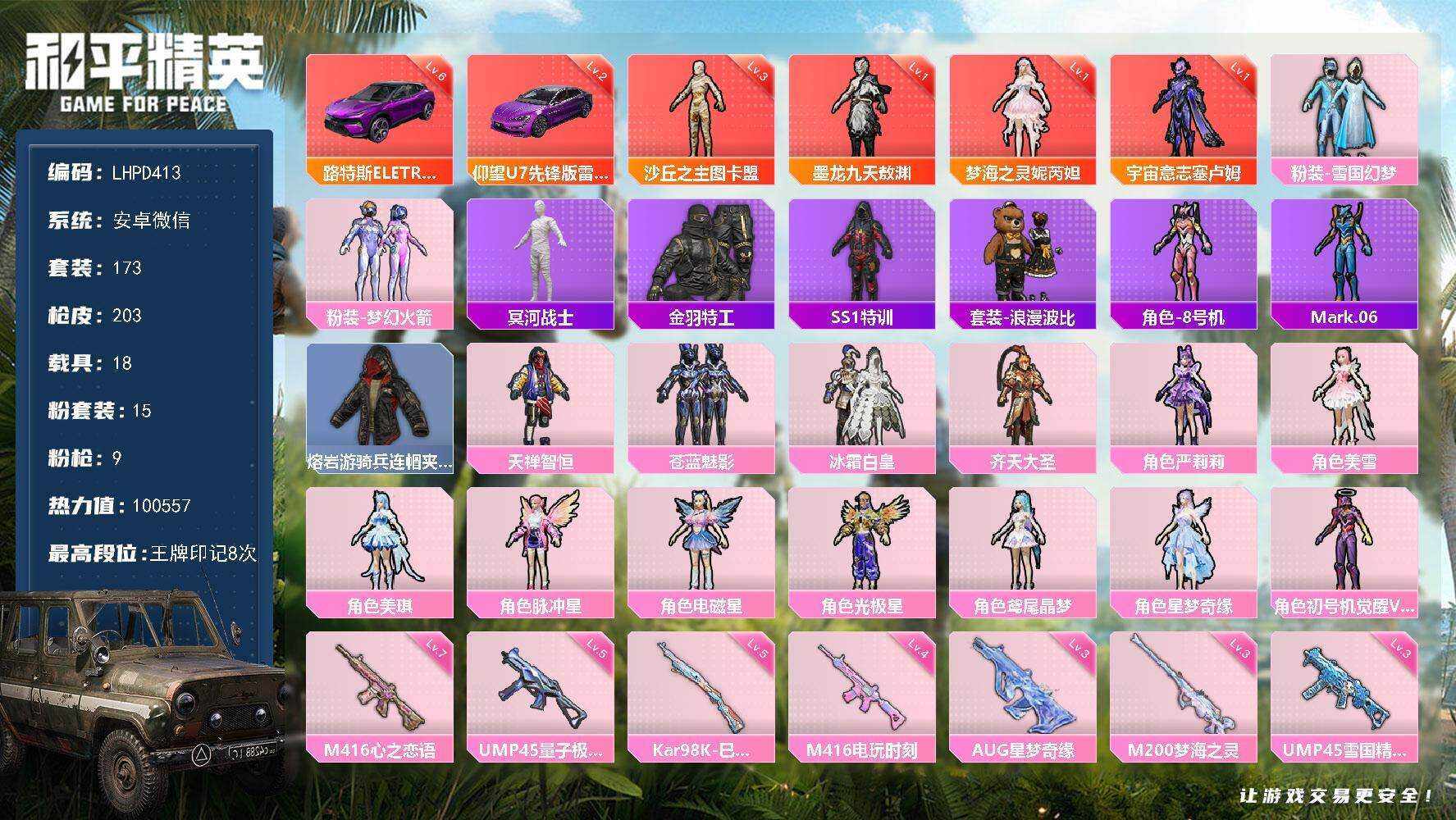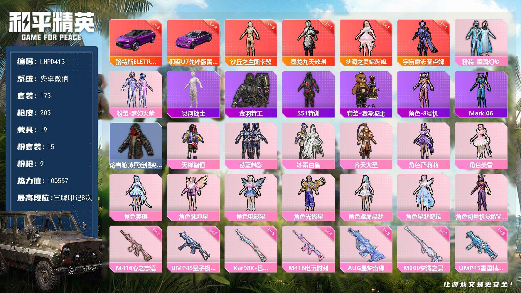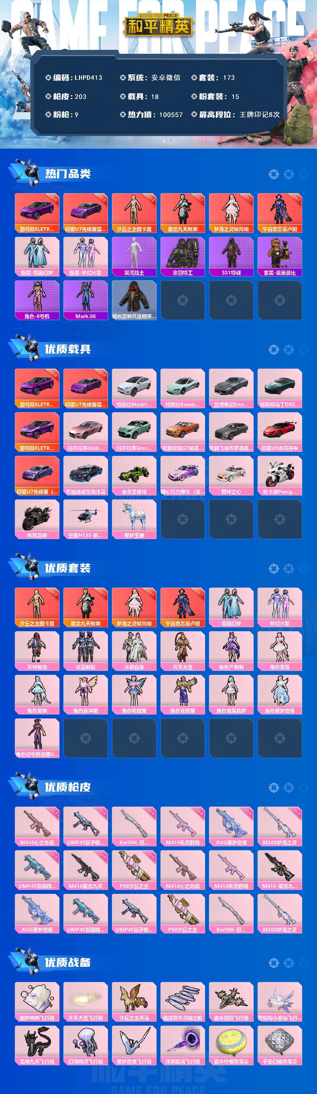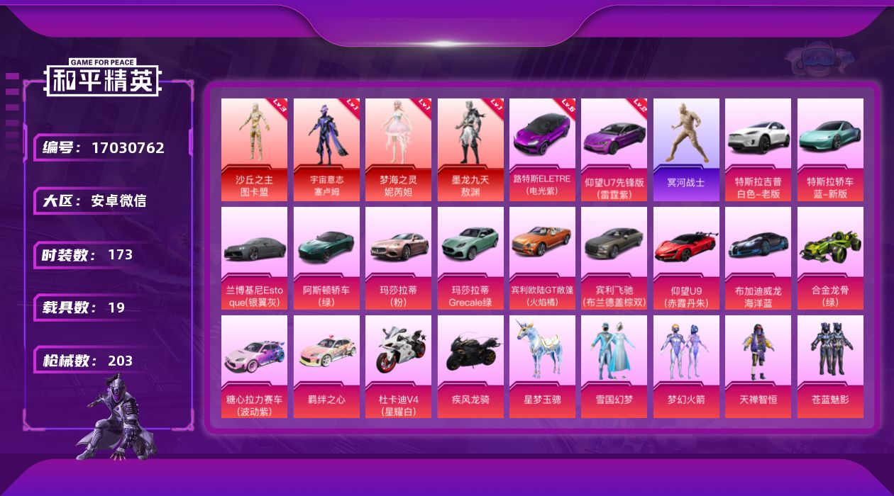 [17030762]【特价出售/店主推荐】安卓 微信-4神装-15粉装-9特效枪-19载具-10粉色飞行器-100557热力值-8王牌印记-173套装-203枪皮【红色载具】:路特斯ELETRE(电光紫)(六级),仰望U7(雷霆紫)(二级)【红色神装等级】:宇宙意志-塞卢姆(一级),梦海之灵-妮芮妲(一级),墨龙九天-敖渊(一级),沙丘之主-图卡盟(三级)【红色角色神装】:宇宙意志-塞卢姆,梦海之灵-妮芮妲,墨龙九天-敖渊,沙丘之主-图卡盟【热门品类】:粉装-雪国幻梦,粉装-梦幻火箭,套装-冥河战士,套装-金羽特工,套装-SS1特训,套装-浪漫波比,角色-8号机,角色-Mark.06,熔岩游骑兵连帽夹克【粉色套装】:粉装-雪国幻梦,粉装-梦幻火箭,粉装-天禅智恒,粉装-苍蓝魅影,粉装-冰霜白皇,粉装-齐天大圣,角色-严莉莉,角色-美雪,角色-美琪,角色-脉冲星,角色-电磁星,角色-光极星,角色-鸢尾晶梦,角色-星梦奇缘,角色-初号机 觉醒Ver.【粉色枪皮等级】:M416-心之恋语(七级),M416-电玩时刻(四级),M416-墨龙九天(三级),AUG-星梦奇缘(三级),UMP45-雪国精灵(三级),UMP45-量子极限(五级),P90-沙丘之主(三级),Kar98K-巳巳如意(五级),M200-梦海之灵(三级)【粉色载具】:特斯拉Model X(珍珠白),特斯拉Roadster(水滴蓝),兰博基尼Estoque(银翼灰),阿斯顿马丁DBS(绿),路特斯ELETRE(电光紫),玛莎拉蒂Ghibli(粉),玛莎拉蒂Grecale(薄荷绿),宾利欧陆GT敞篷(火焰橘),宾利飞驰(布罗德盖棕双色),仰望U9(赤霞丹朱),仰望U7(雷霆紫),布加迪威龙(海洋蓝),合金龙骨(绿),糖心拉力赛车(波动紫),羁绊之心,杜卡迪 Panigale V4(星耀白),疾风龙骑,空客H135-蔚蓝之翼,星梦玉骢【粉色枪皮】:M416-心之恋语,M416-电玩时刻,M416-墨龙九天,AUG-星梦奇缘,UMP45-雪国精灵,UMP45-量子极限,P90-沙丘之主,Kar98K-巳巳如意,M200-梦海之灵【粉色飞行器】:酣梦熊熊飞行器,齐天大圣飞行器,沙丘之主天马,镜域双华-灵镜之阶,鎏金朋克飞行器,巴啦啦小魔仙飞行器,龙翔九天飞行器,幻海精灵飞行器,星梦奇缘飞行器,深渊漩涡飞行器