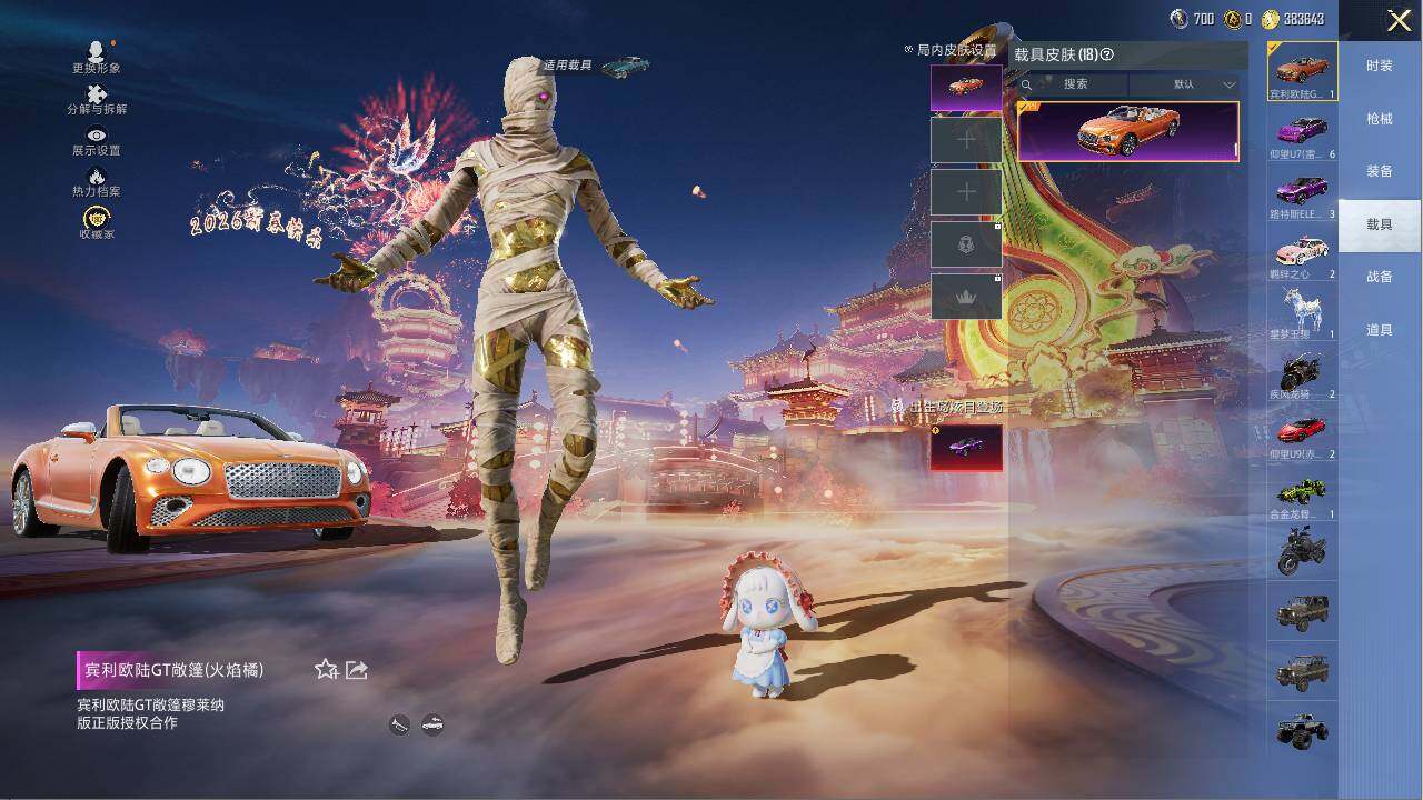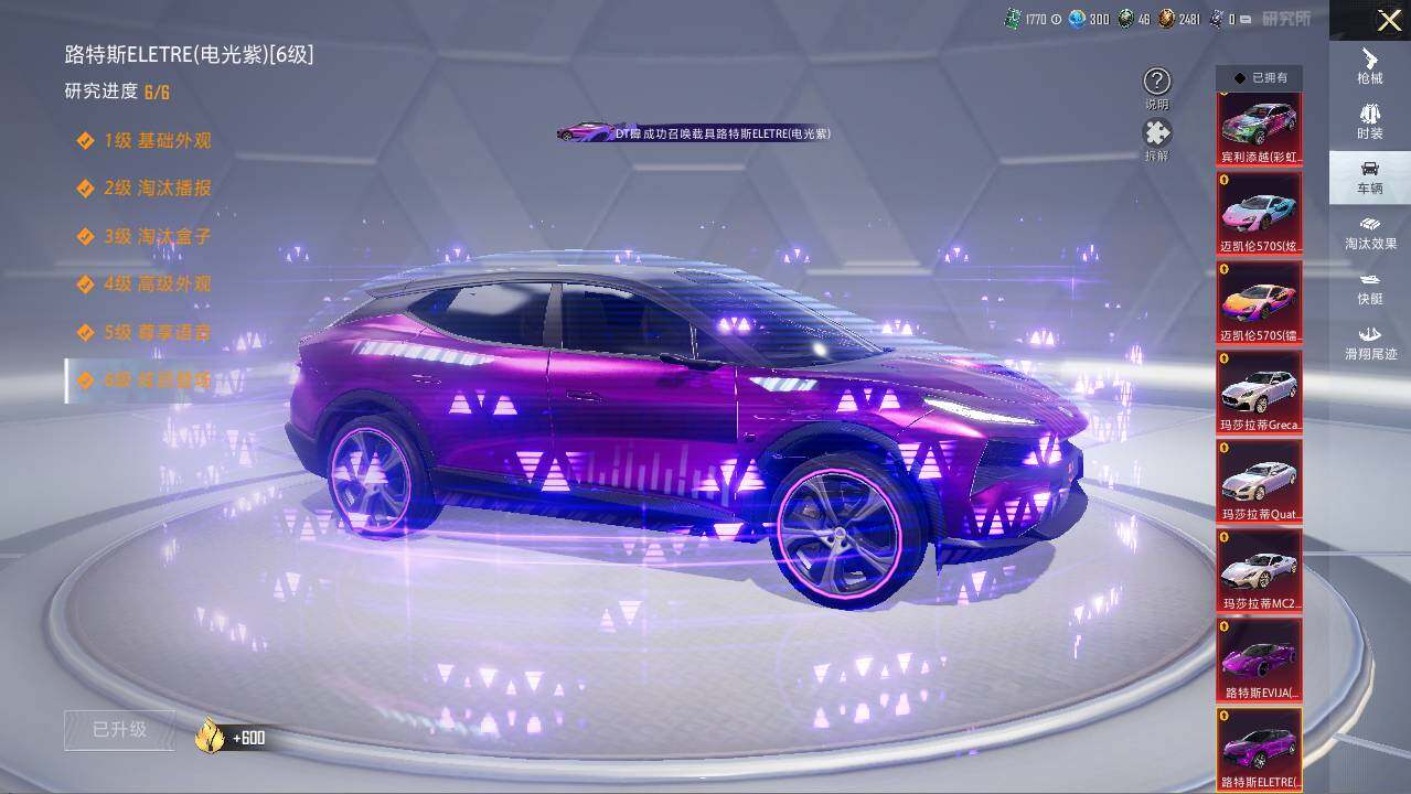 特斯拉Model_X(珍珠白),特斯拉Roadster(水滴蓝),兰博基尼Estoque(银翼灰),阿斯顿·马丁DBS(绿),路特斯ELETRE(电光紫),玛莎拉蒂Ghibli(粉),玛莎拉蒂Grecale(薄荷绿),宾利欧陆GT敞篷(火焰橘),宾利飞驰(布罗德盖棕双色),仰望U9(赤霞丹朱),仰望U7先锋版(雷霆紫),布加迪威龙(海洋蓝),合金龙骨(绿),糖心拉力赛车(波动紫),羁绊之心,杜卡迪_Panigale_V4(星耀白),疾风龙骑,空客H135-蔚蓝之翼,星梦玉骢