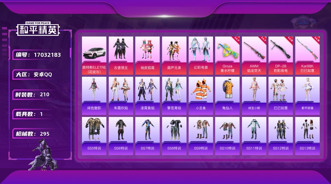 [17032183]安卓 手Q-4粉装-5特效枪-1载具-4粉色飞行器-89286热力值-20王牌印记-210套装-295枪皮