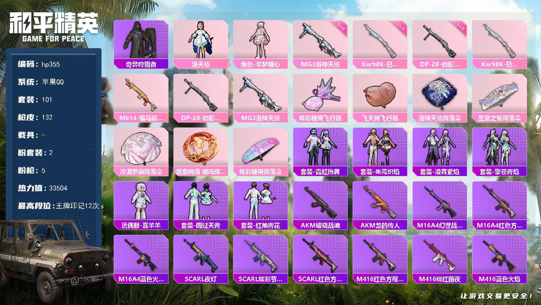 [17032338]苹果 手Q-2粉装-5特效枪-0载具-2粉色飞行器-33504热力值-12王牌印记-101套装-132枪皮
