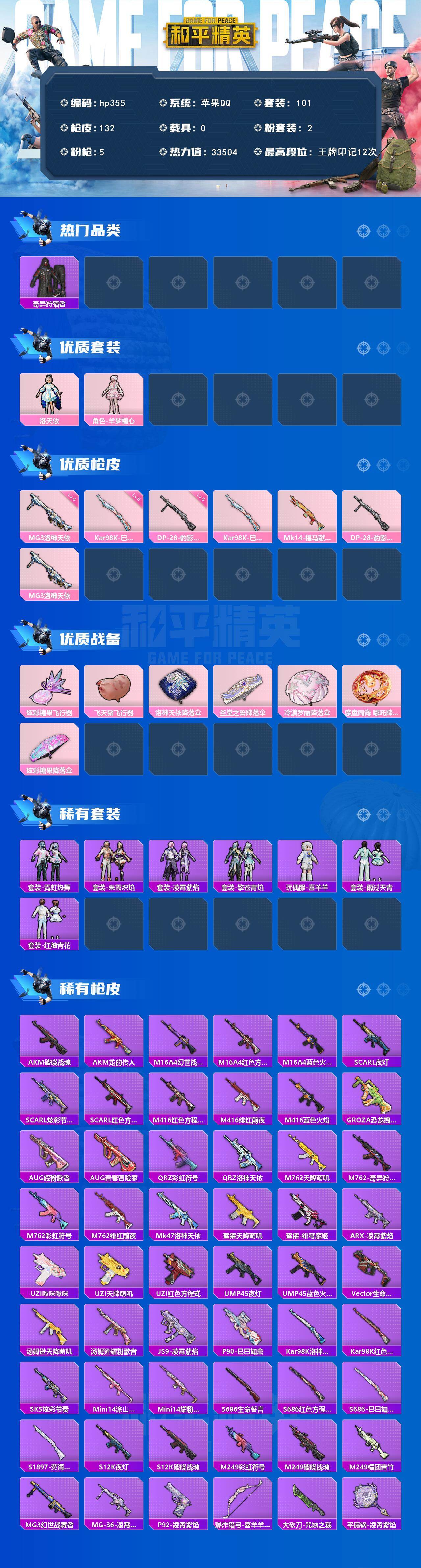 [17032338]苹果 手Q-2粉装-5特效枪-0载具-2粉色飞行器-33504热力值-12王牌印记-101套装-132枪皮 【热门品类】:套装-奇异狩猎者 【粉色套装】:角色-洛天依,角色-羊梦糖心 【粉色枪皮等级】:Kar98K-巳巳如意(五级),DP-28-豹影疾电(五级),MG3-洛神天依(六级) 【粉色枪皮】:Kar98K-巳巳如意,Mk14-福马献瑞,DP-28-豹影疾电,MG3-洛神天依 【粉色飞行器】:炫彩糖果飞行器,飞天猪飞行器 【粉色降落伞】:洛神天依降落伞,圣堂之誓降落伞,冷漠罗丽降落伞,魔童闹海 哪吒降落伞,炫彩糖果降落伞 【稀有套装】:套装-雪国风尚,套装-炫彩糖果,套装-霓虹热舞,套装-朱霞炽焰,套装-凌霄紫焰,套装-擎苍青焰,玩偶服-喜羊羊,套装-雨过天青,套装-红釉青花 【稀有枪皮】:MP5K-天马神君,ARX-天马神君,AUG-冰晶雪宝,AKM-破晓战魂,AKM-龙的传人,M16A4-幻世战舞者,M16A4-红色方程式,M16A4-蓝色火焰,SCAR-L-夜灯,SCAR-L-炫彩节奏,SCAR-L-红色方程式,M416-红色方程式,M416-绯红前夜,M416-蓝色火焰,GROZA-恐龙拽拽,AUG-耀粉歌者,AUG-青春冒险家,QBZ-彩虹符号,QBZ-洛神天依,M762-天降萌叽,M762-奇异狩猎者,M762-彩虹符号,M762-绯红前夜,Mk47-洛神天依,蜜獾-天降萌叽,蜜獾-绯穹魔姬,ARX-凌霄紫焰,UZI-啾咪啾咪,UZI-天降萌叽,UZI-红色方程式,UMP45-夜灯,UMP45-蓝色火焰,Vector-生命誓言,汤姆逊-天降萌叽,汤姆逊-耀粉歌者,JS9-凌霄紫焰,P90-巳巳如意,Kar98K-洛神天依,Kar98K-红色方程式,SKS-炫彩节奏,Mini14-涂山之恋,Mini14-耀粉歌者,S686-生命誓言,S686-红色方程式,S686-巳巳如意,S1897-荧海星豚,S12K-破晓战魂,S12K-夜灯,M249-彩虹符号,M249-破晓战魂,M249-糯团青竹,MG3-幻世战舞者,MG-36-凌霄紫焰,P92-凌霄紫焰,爆炸猎弓-喜羊羊与灰太狼,大砍刀-咒蚀之裁,平底锅-凌霄紫焰,破片手榴弹-巳巳如意 【其他套装】:套装-SS24特训,套装-SS25特训,套装-SS26特训,套装-SS27特训,套装-SS29特训,套