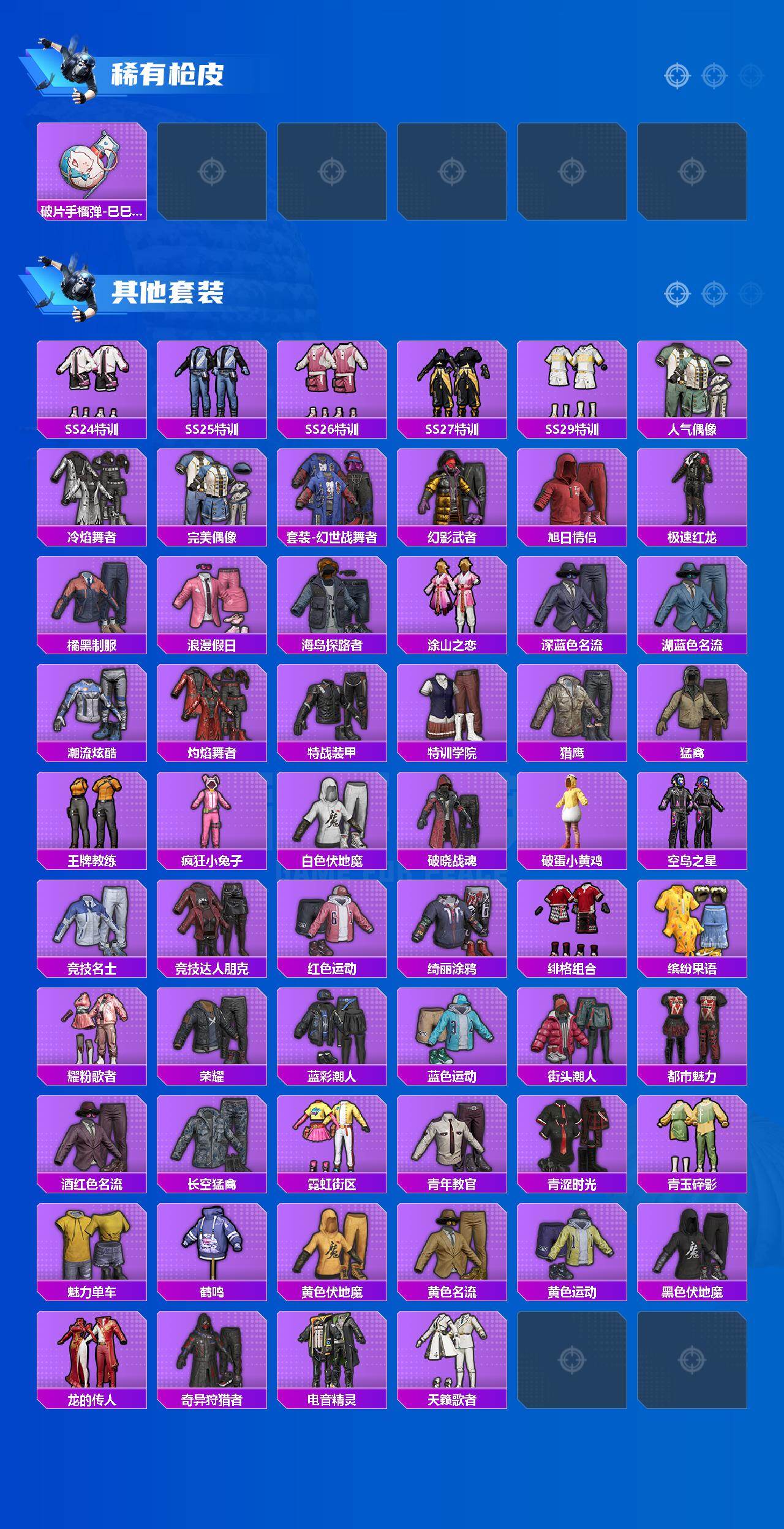 【稀有枪皮】:MP5K-天马神君,ARX-天马神君,AUG-冰晶雪宝,AKM-破晓战魂,AKM-龙的传人,M16A4-幻世战舞者,M16A4-红色方程式,M16A4-蓝色火焰,SCAR-L-夜灯,SCAR-L-炫彩节奏,SCAR-L-红色方程式,M416-红色方程式,M416-绯红前夜,M416-蓝色火焰,GROZA-恐龙拽拽,AUG-耀粉歌者,AUG-青春冒险家,QBZ-彩虹符号,QBZ-洛神天依,M762-天降萌叽,M762-奇异狩猎者,M762-彩虹符号,M762-绯红前夜,Mk47-洛神天依,蜜獾-天降萌叽,蜜獾-绯穹魔姬,ARX-凌霄紫焰,UZI-啾咪啾咪,UZI-天降萌叽,UZI-红色方程式,UMP45-夜灯,UMP45-蓝色火焰,Vector-生命誓言,汤姆逊-天降萌叽,汤姆逊-耀粉歌者,JS9-凌霄紫焰,P90-巳巳如意,Kar98K-洛神天依,Kar98K-红色方程式,SKS-炫彩节奏,Mini14-涂山之恋,Mini14-耀粉歌者,S686-生命誓言,S686-红色方程式,S686-巳巳如意,S1897-荧海星豚,S12K-破晓战魂,S12K-夜灯,M249-彩虹符号,M249-破晓战魂,M249-糯团青竹,MG3-幻世战舞者,MG-36-凌霄紫焰,P92-凌霄紫焰,爆炸猎弓-喜羊羊与灰太狼,大砍刀-咒蚀之裁,平底锅-凌霄紫焰,破片手榴弹-巳巳如意