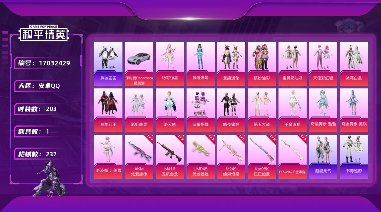 [17032429]安卓 手Q-17粉装-7特效枪-1载具-5粉色飞行器-87994热力值-13王牌印记-203套装-237枪皮 【热门品类】:粉装-童趣迷兔,粉装-缤纷油彩,套装-浪漫天命,套装-小丑鱼,套装-胖达圆圆,套装-暗影哥特,套装-浪漫波比,套装-粉红小猪,套装-红熊茄茄 【粉色套装】:角色-绝对恒星,粉装-宝贝奶油派,粉装-天使彩虹糖,粉装-缤纷油彩,粉装-冰霜白皇,粉装-童趣迷兔,粉装-炙焰红王,粉装-彩虹鹿灵,角色-洛天依,粉装-蓝莓炮弹,粉装-暗夜鎏金,粉装-第五大道,角色-千金淑猫,角色-奇迹舞步 雅雅,角色-奇迹舞步 美琪,角色-奇迹舞步 美雪,角色-异瞳寒姬 【粉色枪皮等级】:AKM-炫紫旋律(七级),M416-五爪金龙(七级),UMP45-恐龙拽拽(七级),Kar98K-巳巳如意(五级),M249-绝对恒星(五级),DP-28-千金淑猫(四级) 【粉色载具】:保时捷Panamera(星辰紫) 【粉色枪皮】:AKM-炫紫旋律,M416-五爪金龙,UMP45-恐龙拽拽,Kar98K-巳巳如意,Mk14-福马献瑞,M249-绝对恒星,DP-28-千金淑猫 【粉色飞行器】:绝对恒星飞行器,炫彩糖果飞行器,梦之光华飞行器,天之羽翼飞行器,千面幻镜飞行器 【粉色降落伞】:绝对恒星降落伞,百万伏特降落伞,粉色回忆降落伞,春暖花开降落伞,梦幻火箭降落伞,神秘黑猫降落伞,童趣迷兔降落伞,香水柠檬降落伞,烈焰拳霸降落伞,蓝莓炮弹降落伞,绚金瑰梦降落伞,碧影闪光降落伞,暗夜鎏金降落伞,第五大道降落伞,圣堂之誓降落伞,精灵梦叶罗丽降落伞,千金淑猫降落伞,樱桃泡泡降落伞,异瞳寒姬降落伞,炫彩糖果降落伞 【稀有套装】:套装-超能元气,角色-超感刻度,角色-甜心蒙太奇,套装-雪国风尚,套装-炫彩糖果,角色-都市丽猫,角色-摩登魅猫,角色-俏兔智灵,角色-糖霜甜心,角色-蜜桃派对,套装-书海巡游,套装-画境星梦,套装-琴音绮想 【稀有枪皮】:AUG-冰晶雪宝,AKM-夜灯,AKM-彩虹符号,AKM-灼热熔岩,AKM-百万伏特,AKM-破晓战魂,AKM-萌趣颜团子,AKM-虎虎生威,AKM-霓虹街区,AKM-龙的传人,M16A4-幻世战舞者,M16A4-甜心亚梦,M16A4-莲影清波,M16A4-千金淑猫,SCAR-L-炫彩节奏,SCAR-L-玉兔迎春,SCAR-L-碧影闪光,SCAR-L