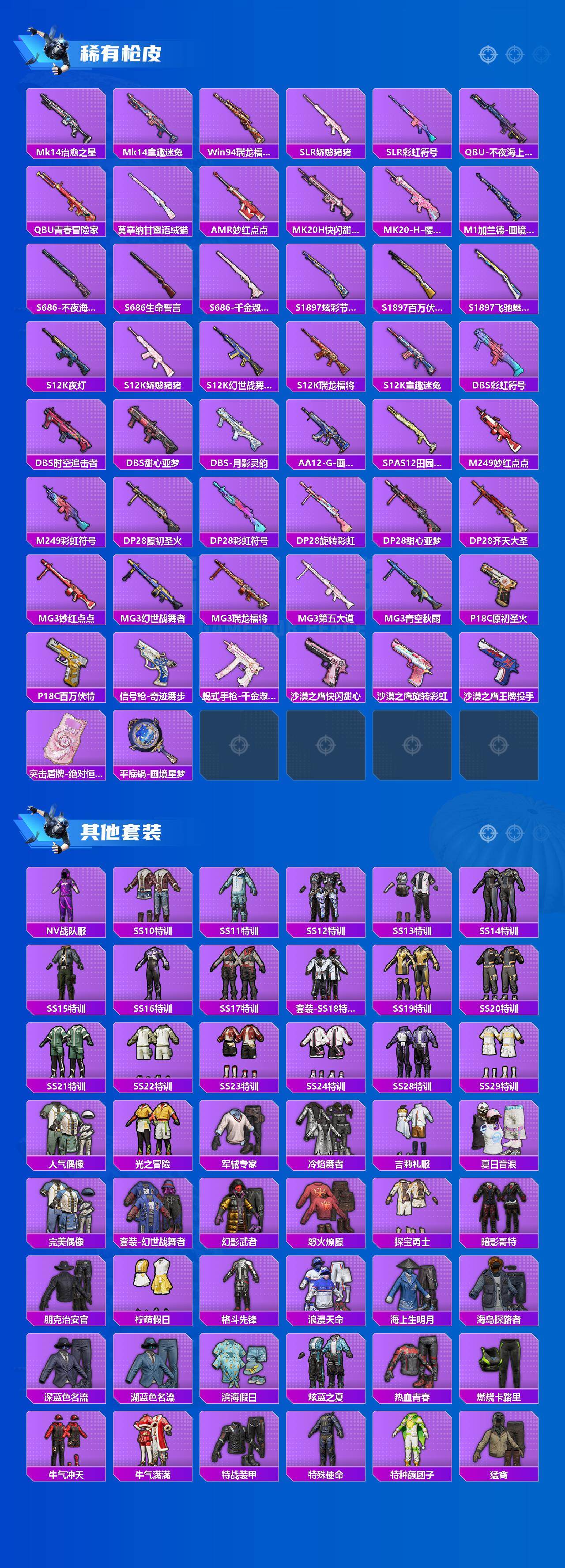 【稀有枪皮】:AUG-冰晶雪宝,AKM-夜灯,AKM-彩虹符号,AKM-灼热熔岩,AKM-百万伏特,AKM-破晓战魂,AKM-萌趣颜团子,AKM-虎虎生威,AKM-霓虹街区,AKM-龙的传人,M16A4-幻世战舞者,M16A4-甜心亚梦,M16A4-莲影清波,M16A4-千金淑猫,SCAR-L-炫彩节奏,SCAR-L-玉兔迎春,SCAR-L-碧影闪光,SCAR-L