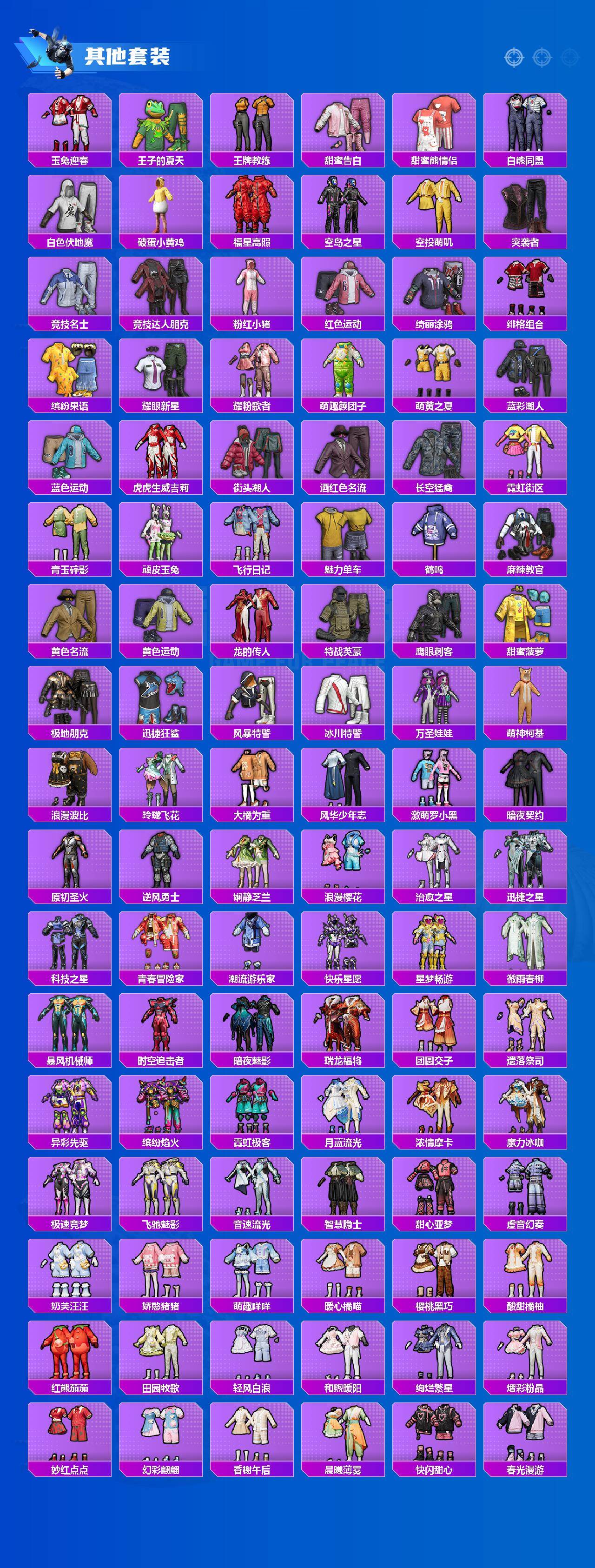 套装-缤纷油彩,套装-胖达圆圆,套装-浪漫波比,套装-宝贝奶油派,套装-天使彩虹糖,套装-炙焰红王,套装-彩虹鹿灵,角色-洛天依,套装-蓝莓炮弹,套装-暗夜鎏金,套装-第五大道,角色-千金淑猫,套装-鹰眼刺客,套装-迅捷狂鲨,套装-万圣娃娃,套装-萌神柯基,套装-大橘为重,套装-奶芙汪汪