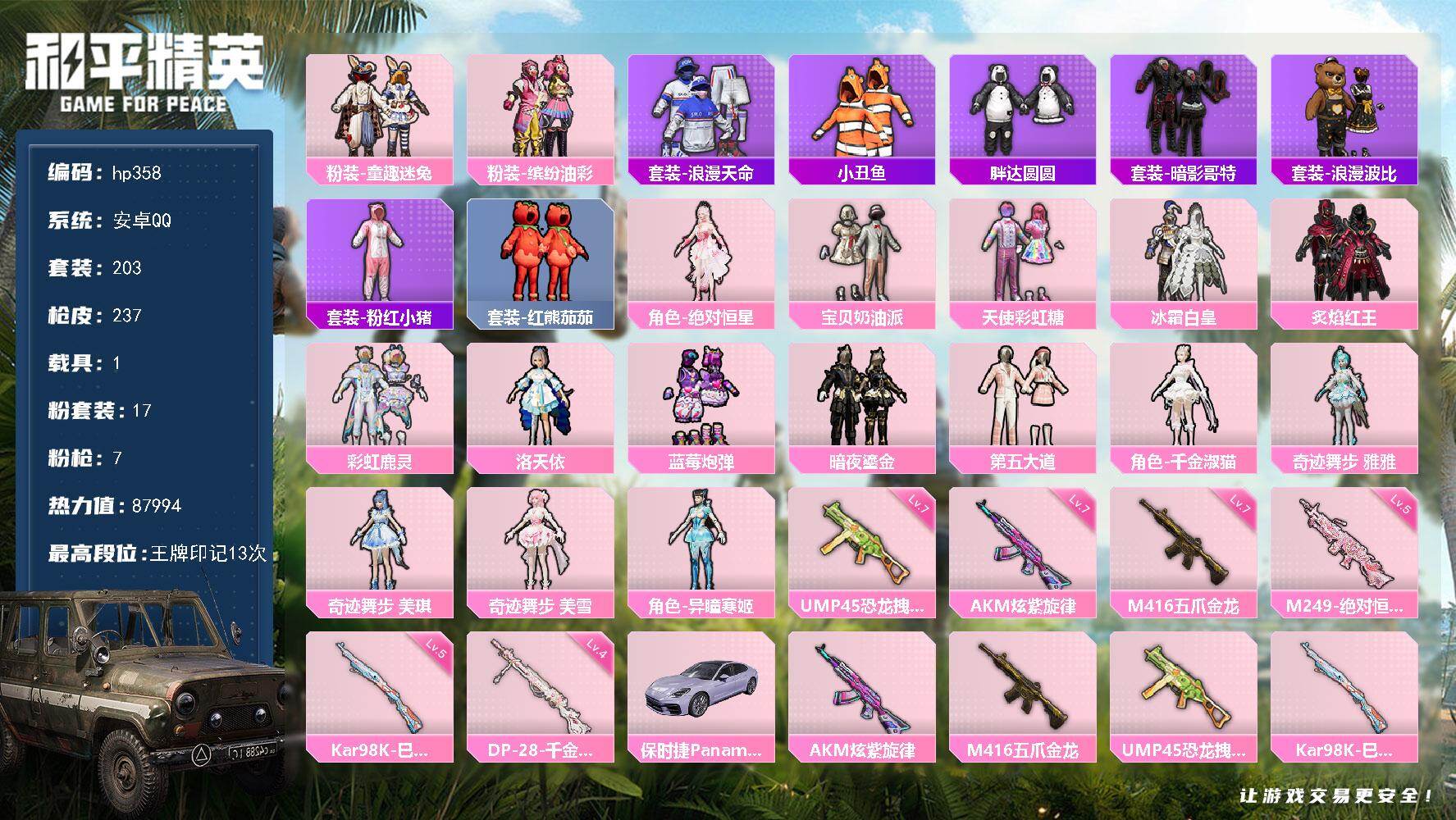 [17032429]安卓 手Q-17粉装-7特效枪-1载具-5粉色飞行器-87994热力值-13王牌印记-203套装-237枪皮