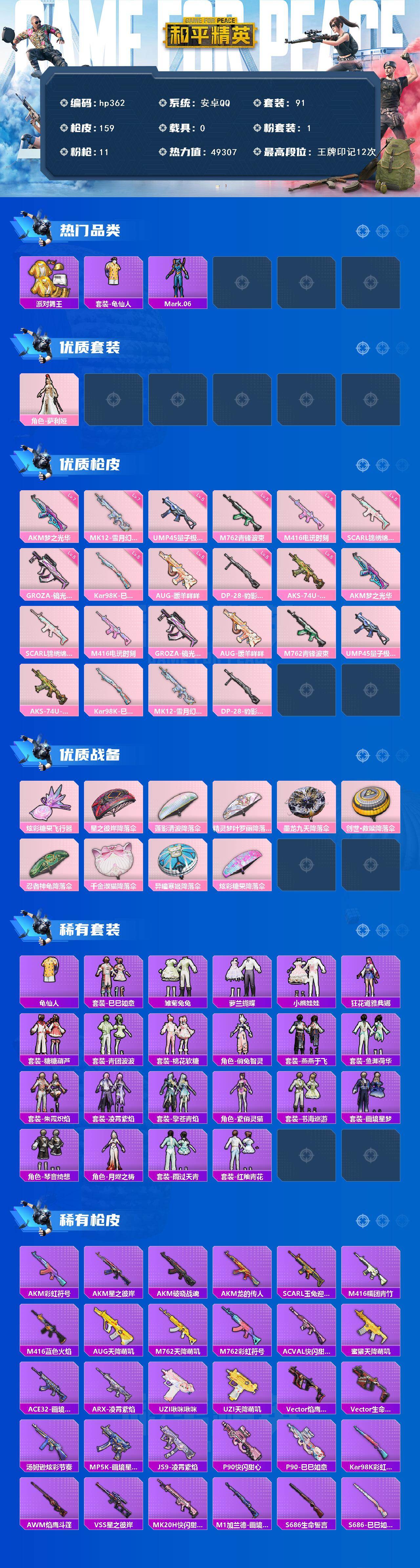 [17032547]安卓 手Q-1粉装-11特效枪-0载具-1粉色飞行器-49307热力值-12王牌印记-91套装-159枪皮 【热门品类】:套装-派对舞王,套装-龟仙人,角色-Mark.06 【粉色套装】:角色-萨利娅 【粉色枪皮等级】:AKM-梦之光华(七级),SCAR-L-锦绣绵绵(五级),M416-电玩时刻(五级),GROZA-镜光银凌(五级),AUG-暖羊咩咩(五级),M762-青锋波束(五级),UMP45-量子极限(五级),AKS-74U-森灵之息(五级),Kar98K-巳巳如意(五级),MK12-雪月幻音(七级),DP-28-豹影疾电(五级) 【粉色枪皮】:AKM-梦之光华,SCAR-L-锦绣绵绵,M416-电玩时刻,GROZA-镜光银凌,AUG-暖羊咩咩,M762-青锋波束,UMP45-量子极限,AKS-74U-森灵之息,Kar98K-巳巳如意,MK12-雪月幻音,DP-28-豹影疾电 【粉色飞行器】:炫彩糖果飞行器 【粉色降落伞】:星之彼岸降落伞,莲影清波降落伞,精灵梦叶罗丽降落伞,墨龙九天降落伞,创世·救赎降落伞,忍者神龟降落伞,千金淑猫降落伞,异瞳寒姬降落伞,炫彩糖果降落伞 【稀有套装】:套装-龟仙人,套装-巳巳如意,套装-雪国风尚,套装-炫彩糖果,套装-雏菊兔兔,套装-萝兰蝴蝶,套装-小熊娃娃,角色-狂花道·雅典娜,套装-糖糖葫芦,套装-青团波波,套装-棉花软糖,角色-俏兔智灵,套装-燕燕于飞,套装-鱼渊荷华,套装-朱霞炽焰,套装-凌霄紫焰,套装-擎苍青焰,角色-紫俏灵猫,套装-书海巡游,套装-画境星梦,套装-琴音绮想,角色-月烬之祷,套装-雨过天青,套装-红釉青花 【稀有枪皮】:AUG-冰晶雪宝,AKM-彩虹符号,AKM-星之彼岸,AKM-破晓战魂,AKM-龙的传人,SCAR-L-玉兔迎春,M416-糯团青竹,M416-蓝色火焰,AUG-天降萌叽,M762-天降萌叽,M762-彩虹符号,AC-VAL-快闪甜心,蜜獾-天降萌叽,ACE32-画境星梦,ARX-凌霄紫焰,UZI-啾咪啾咪,UZI-天降萌叽,Vector-焰鹰斗篷,Vector-生命誓言,汤姆逊-炫彩节奏,MP5K-画境星梦,JS9-凌霄紫焰,P90-快闪甜心,P90-巳巳如意,Kar98K-彩虹符号,AWM-焰鹰斗篷,VSS-星之彼岸,MK20-H-快闪甜心,M1加兰德-画境星梦,S686-生命誓