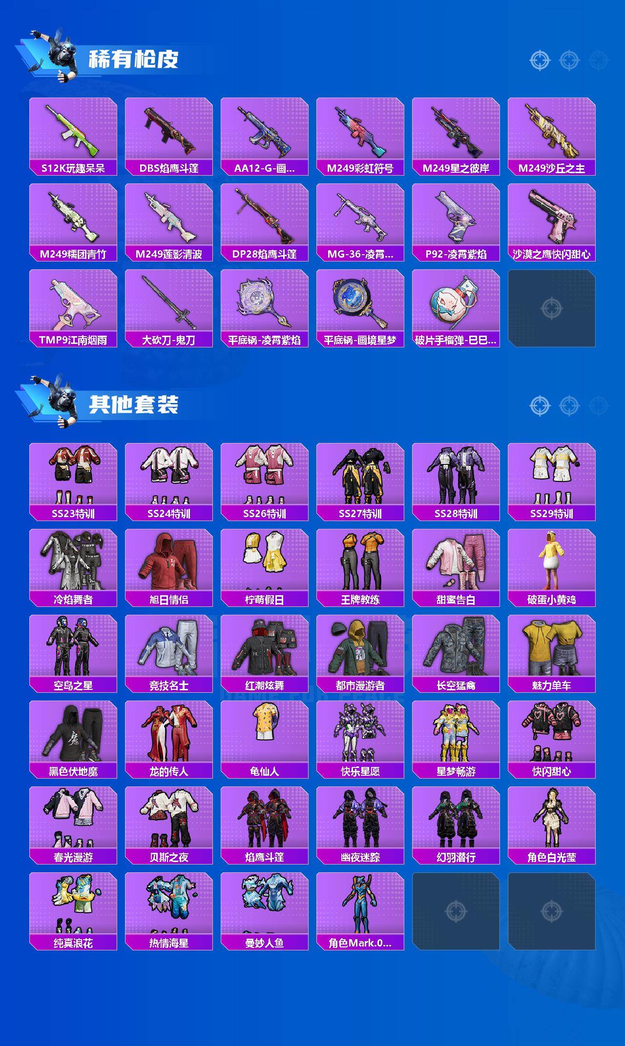 - [11794995]2粉装 4特效枪 1印记 可二次 可修改实名 连体王者 身法装备:8号机(新粉螳螂),Mark.06(新蓝螳螂) 优质装备:UMP45量子极限,GROZA-镜光银凌,月影灵韵,Kar98K-巳巳如意 热门装扮:紫电风暴,深海小丑鱼 稀有枪皮:DP-28-豹影疾电 五级特效枪:五级UMP45-量子极限,五级GROZA-镜光银凌,五级Kar98K-巳巳如意 一级特效枪:一级DP-28-豹影疾电 紫色装扮:SS31特训套装,冷焰舞者,缤纷果语,黑色伏地魔,冰河战士,蝶变,幻世战舞者,破蛋小黄鸡,福星高照,雏菊兔兔,萝兰蝴蝶,SS29特训,星途旅人,纯真浪花,热情海星,SS28特训,铁血战翼,8号机(新粉螳螂),Mark.06(新蓝螳螂),鱼渊荷华,燕燕于飞,巳巳如意,森林游猎者,竞技名士,许七安,智谋强哥,奇趣章鱼,耀粉歌者,蓝冰羽,SS32特训服(SS32特训套装),青玉碎影,新风雅兰,恋语绒绒,金耀舞者 优质战备:守护天翼降落伞,创世·救赎降落伞,公主华盖飞行器,金丰海韵降落伞,临安公主降落伞,百万伏特降落伞