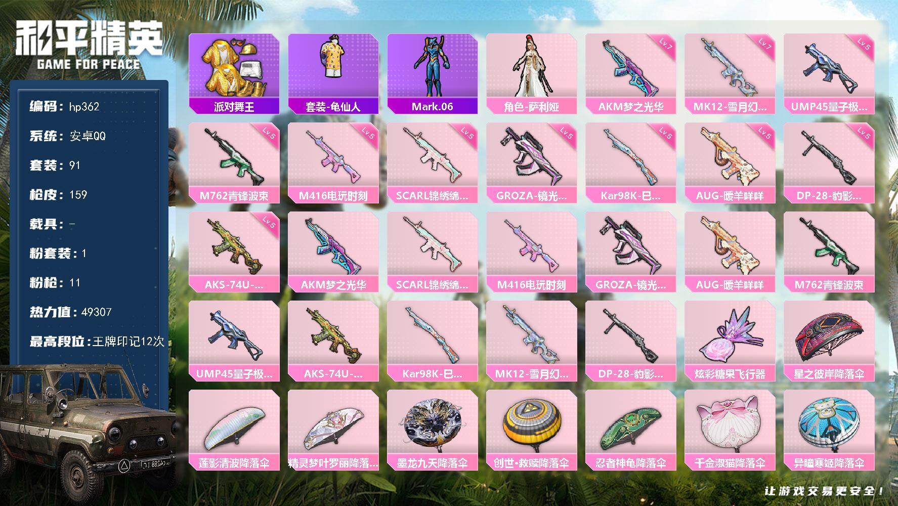 [17032547]安卓 手Q-1粉装-11特效枪-0载具-1粉色飞行器-49307热力值-12王牌印记-91套装-159枪皮