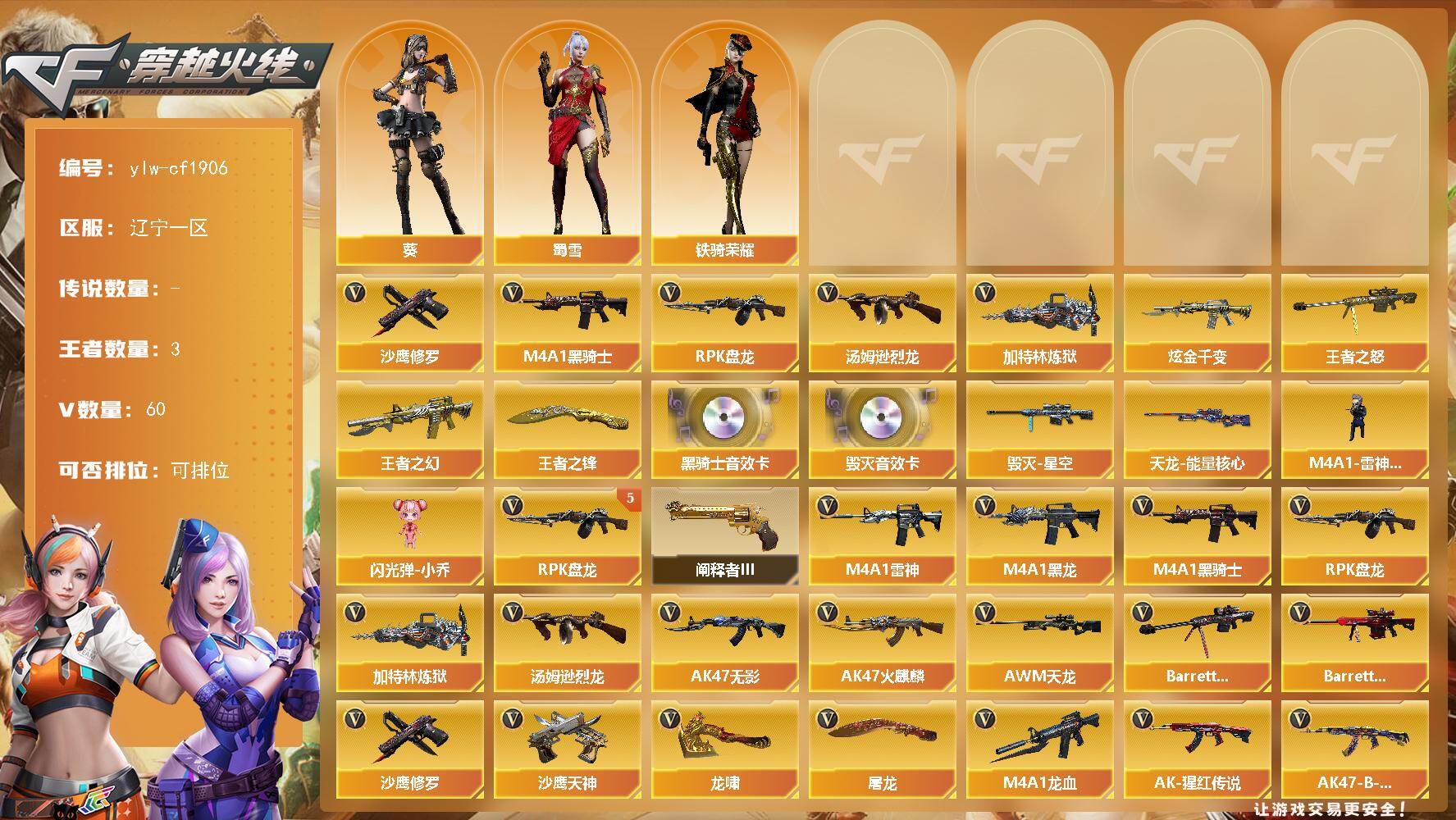 [16995773]辽宁一区-60V-3王者-1炫金 【热门武器】:M4A1-黑骑士,汤姆逊-烈龙*3,RPK-盘龙*5,加特林-炼狱,沙鹰-修罗*2 【王者炫金武器】:炫金千变,王者之幻,王者之怒,王者之锋 【音效卡】:M4A1-黑骑士音效卡,Barrett-毁灭音效卡 【稀有皮肤】:毁灭-星空,天龙-能量核心 【角色】:葵,蜀雪,铁骑荣耀 【人偶武器】:M4A1-雷神-精英刀锋,闪光弹-小乔 【挑战大师】:阐释者III 【英雄级武器】:M4A1-雷神*3,M4A1-黑龙,M4A1-黑骑士,RPK-盘龙*5,加特林-炼狱,汤姆逊-烈龙*3,AK47-无影,AK47-火麒麟,AWM-天龙,Barrett-毁灭*4,Barrett-极光*3,M4A1-龙血,AK-47-猩红传说*11,AK47-B-战神,沙鹰-天神*2,沙鹰-修罗*2,龙啸*2,屠龙*4 【特殊枪械】:,1黑骑士,3烈龙,5盘龙,1炼狱